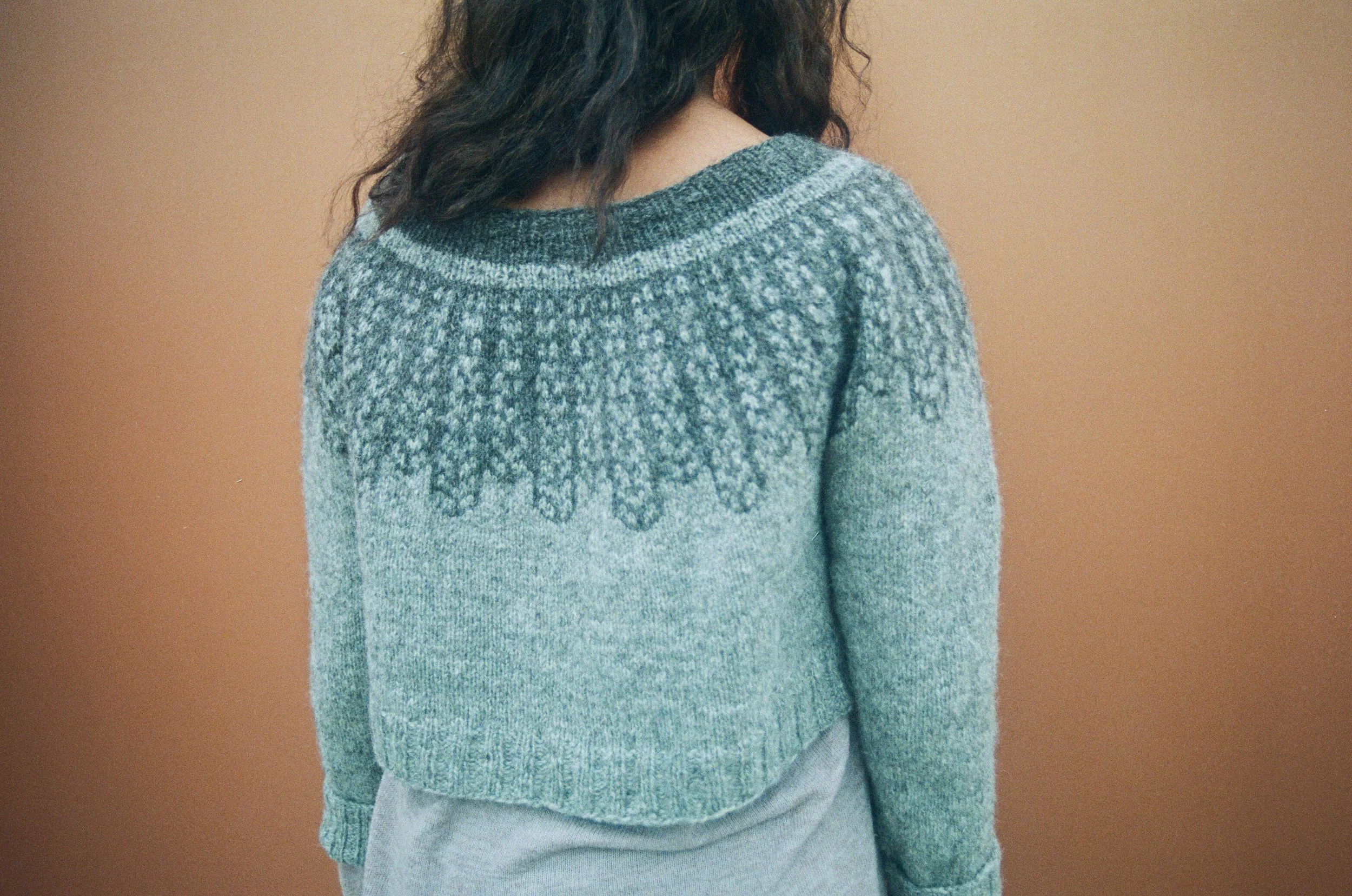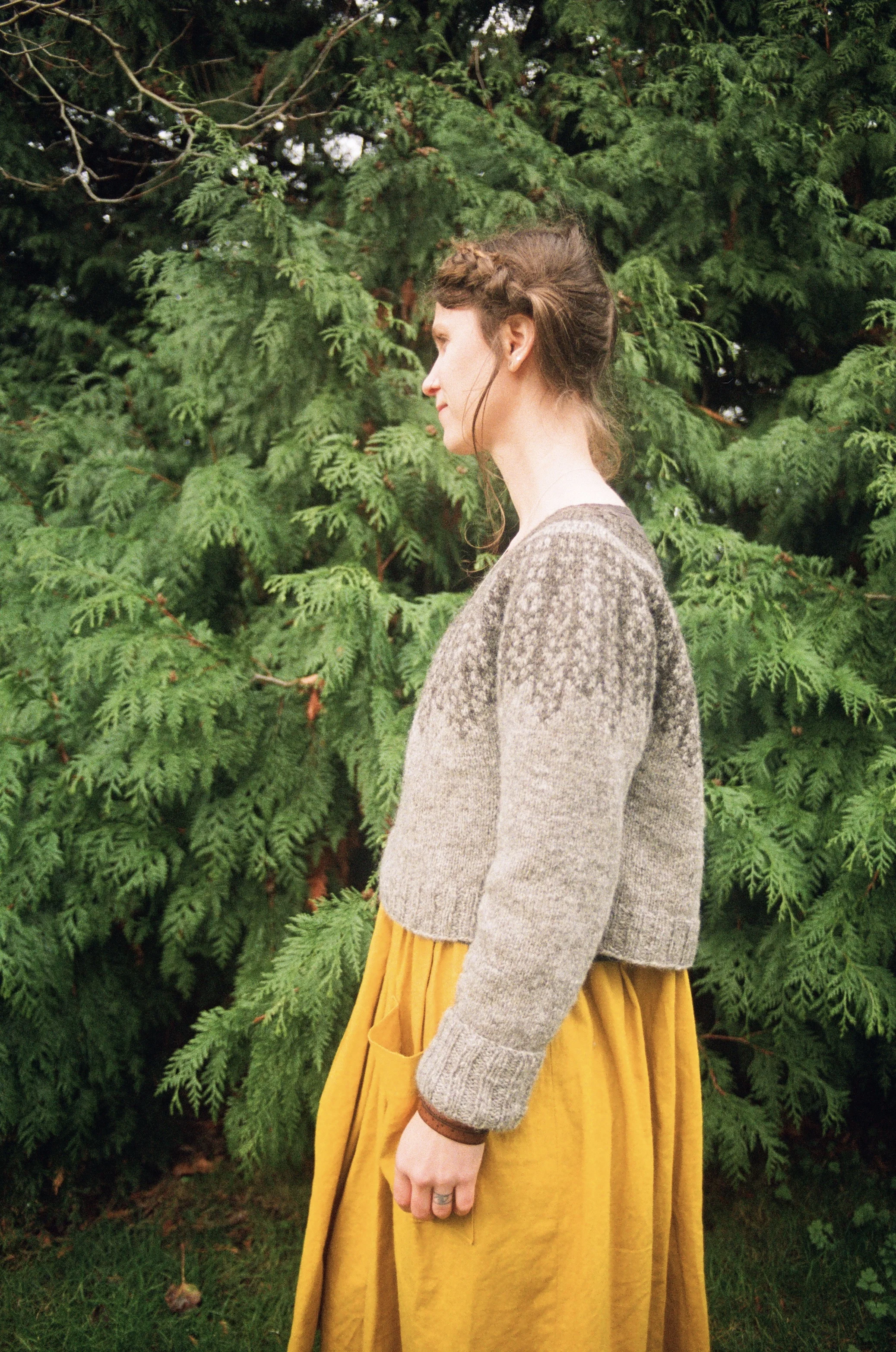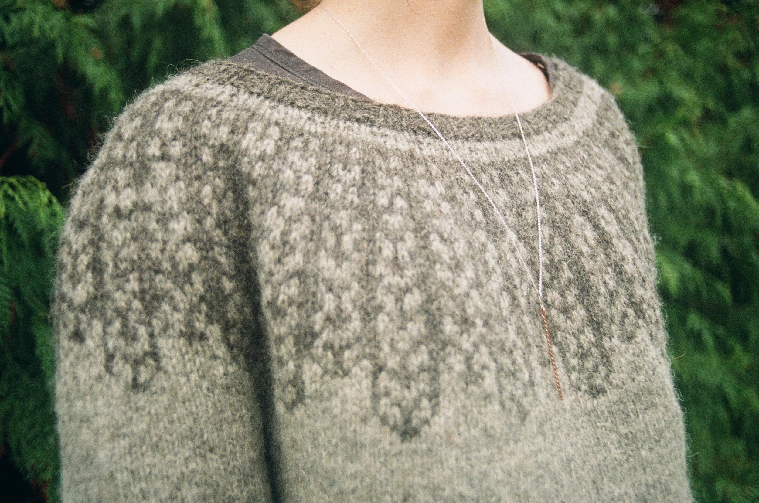 To make the pullover, you’ll need the cardigan pattern. Below I’ll explain how to modify it to take out the steek and add in an extra half-motif.