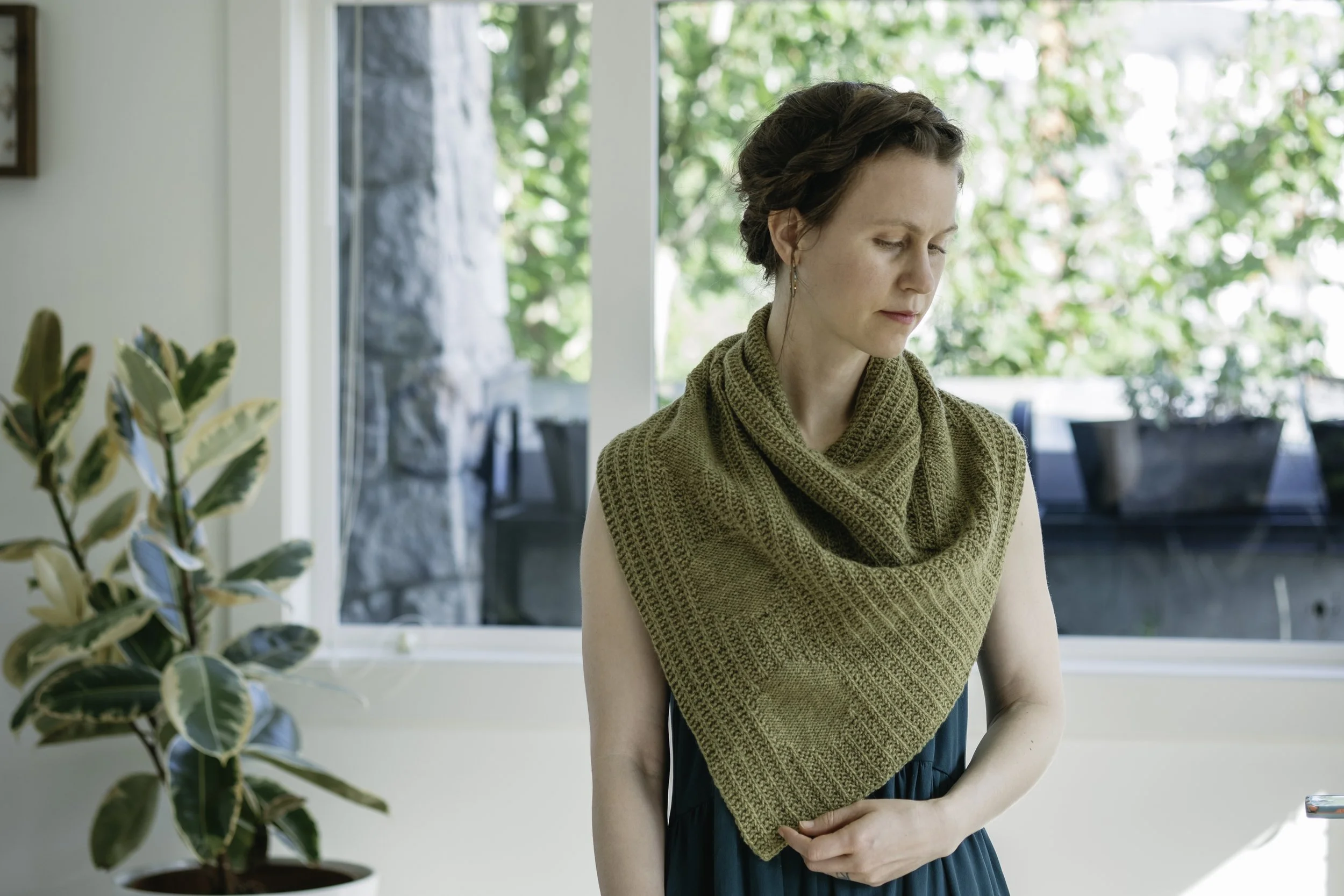 This clever cowl is worked as a flat rectangle with pretty textures and big circles motifs (I think of full moons, but maybe they’re more of some warm spring sun?) One seam creates the faux-shawl shape that will adorn all your transitional outfits.
