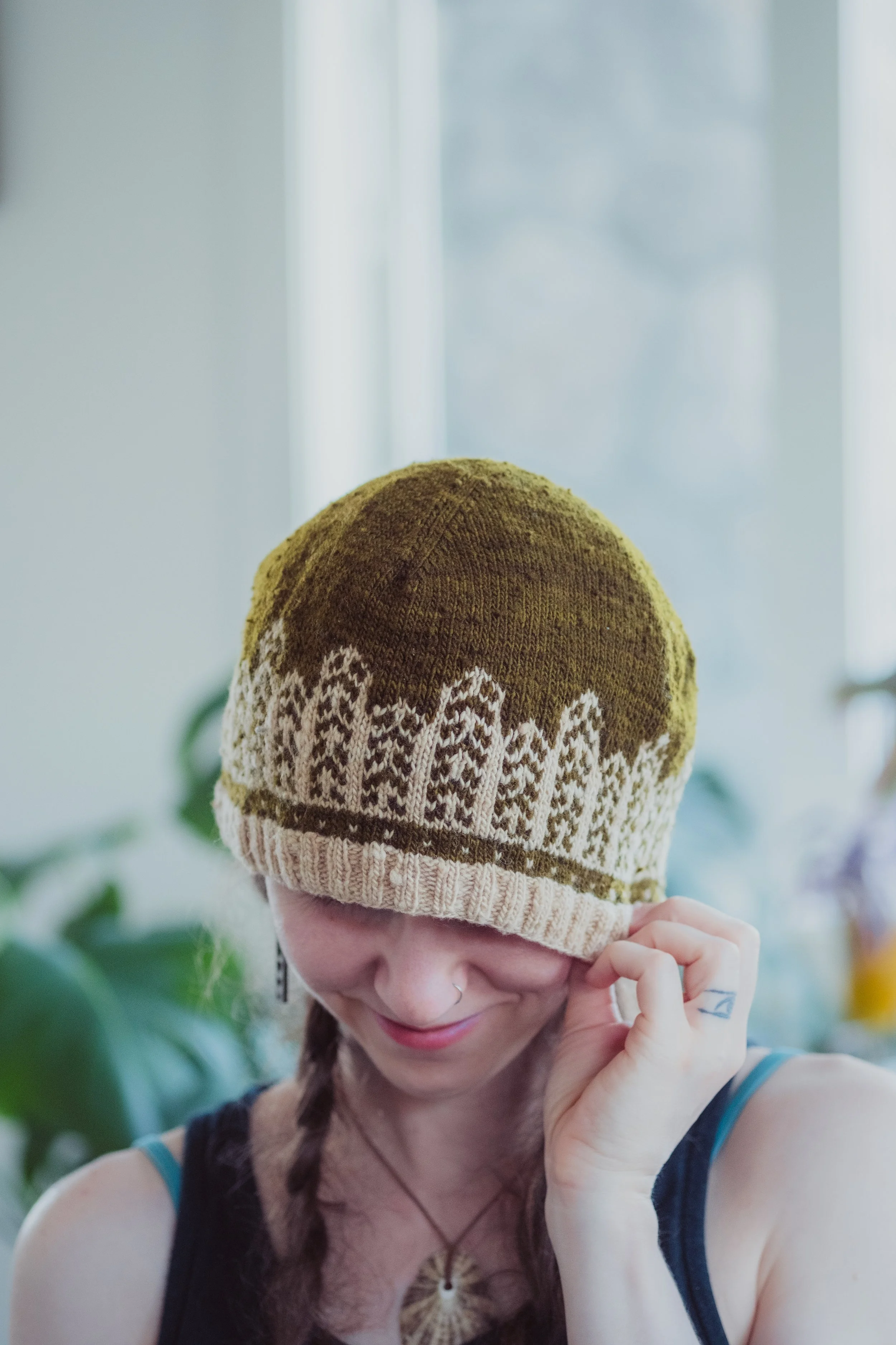 Crashing waves adorn this worsted weight hat, some meditative colourwork that will keep your ears warm on beach walks and forest hikes.