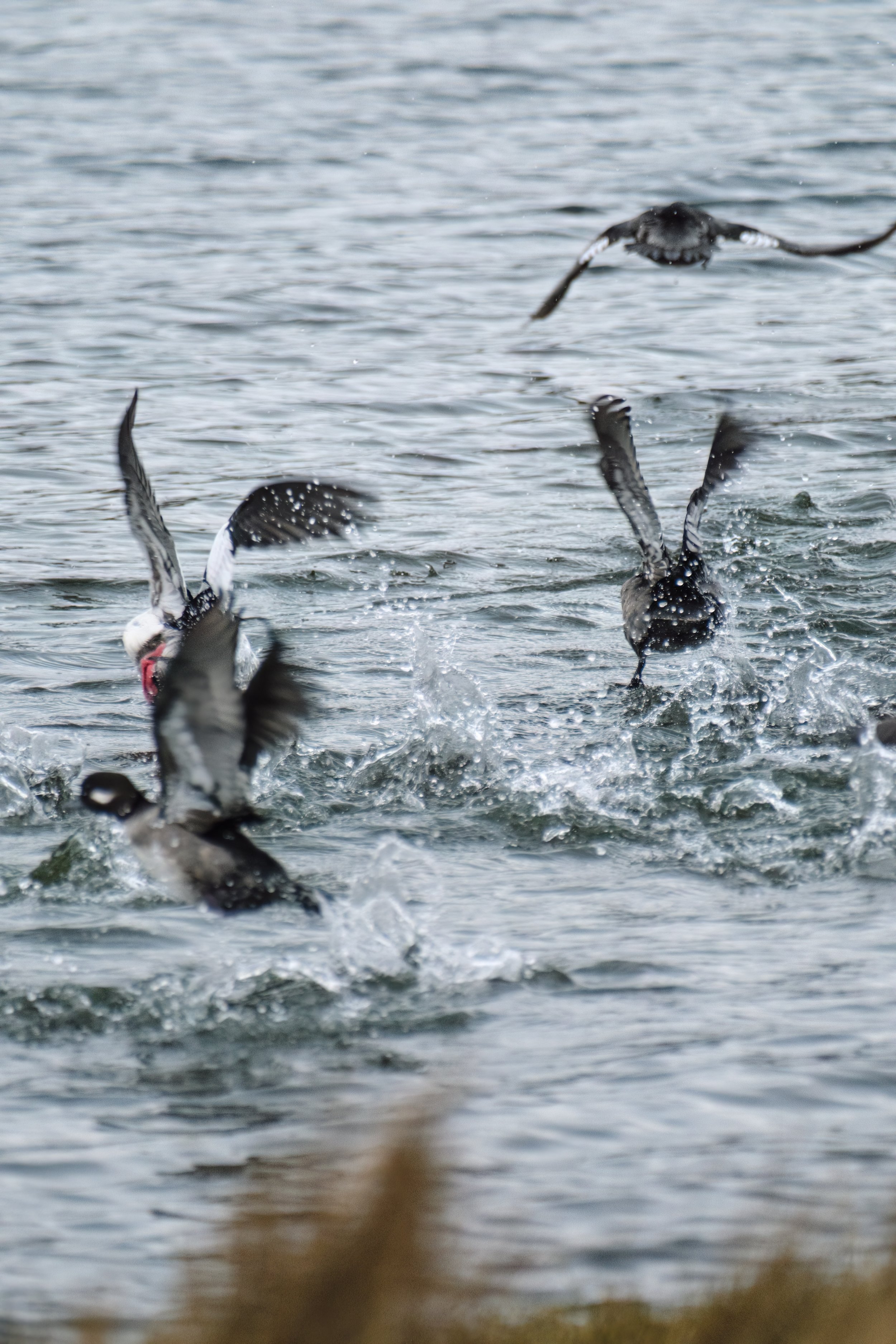 A flotilla of buffleheads! I love how this picture shows the size difference between the males and females and just how adorable they all are. I love when water birds take off because it always looks so chaotic, with splashes and patterned wings everywhere!