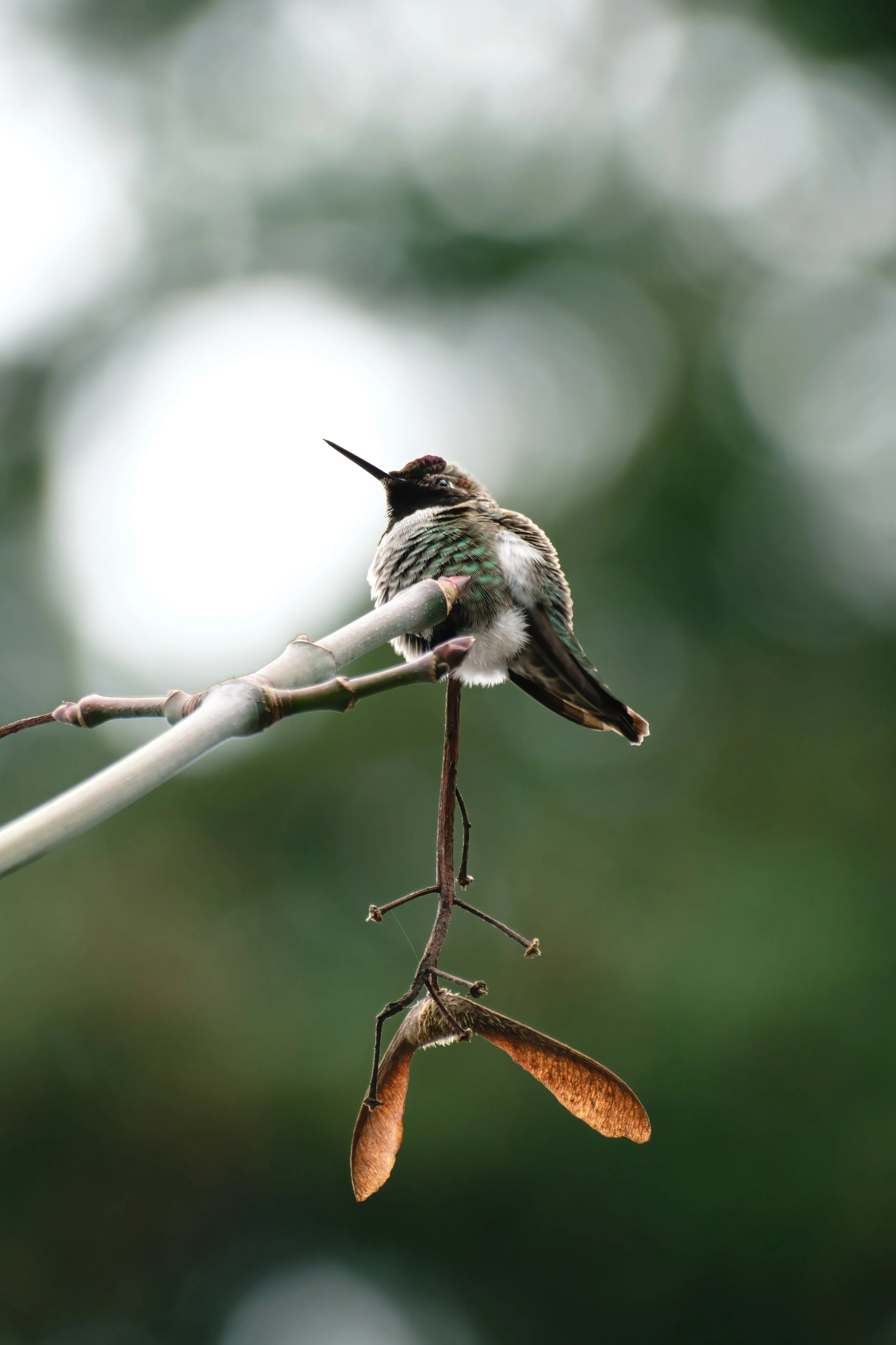 A male Anna’s hummingbird is perched on the tip of a branch that has a maple key hanging below.