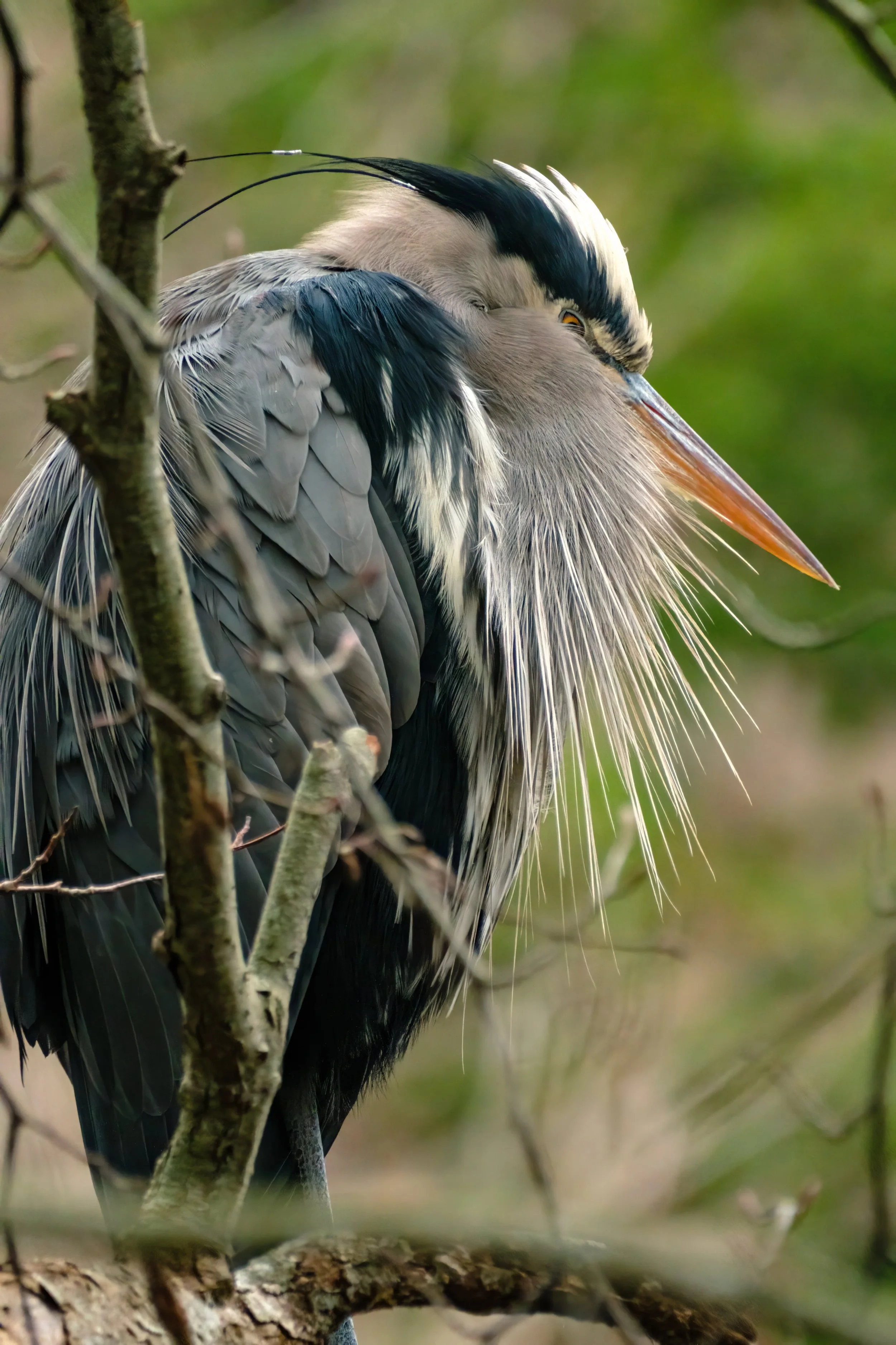 Closeup of a greet blue heron hunched as it perches on a tree branch. You can just see one eye peeking out behind dramatic grey and white feathers.