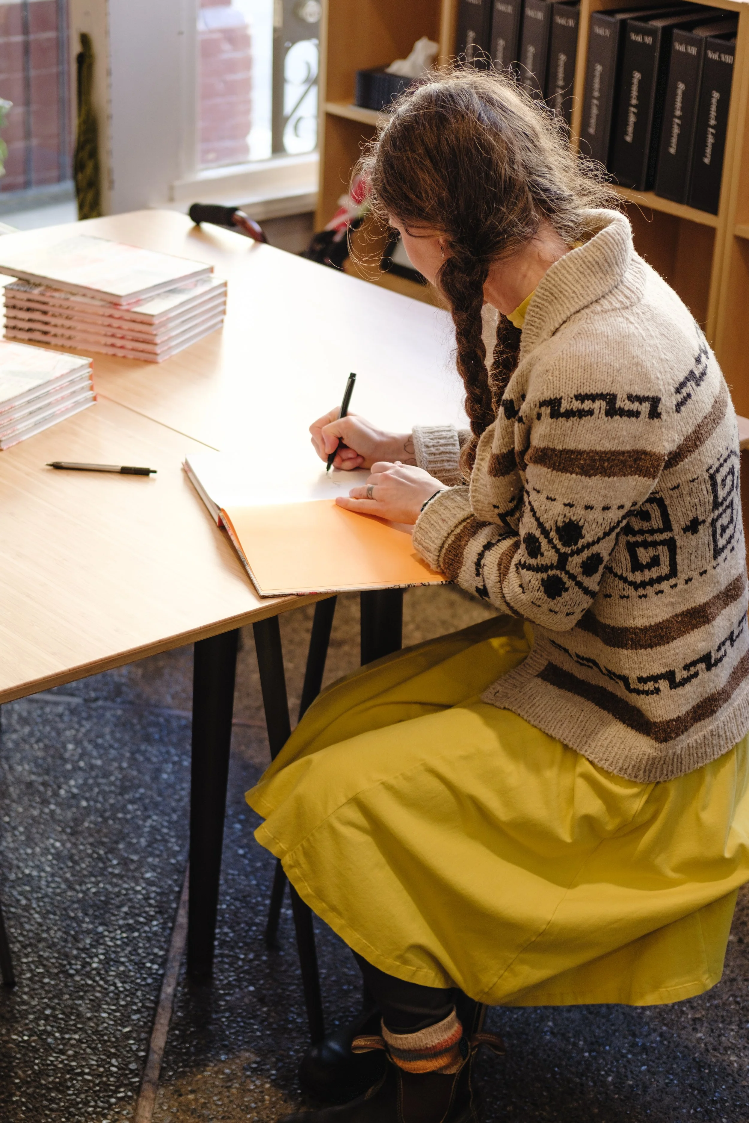 Andrea is sitting at a table signing books. She’s wearing a yellow dress and patterned Knitter’s Dude cardigan.
