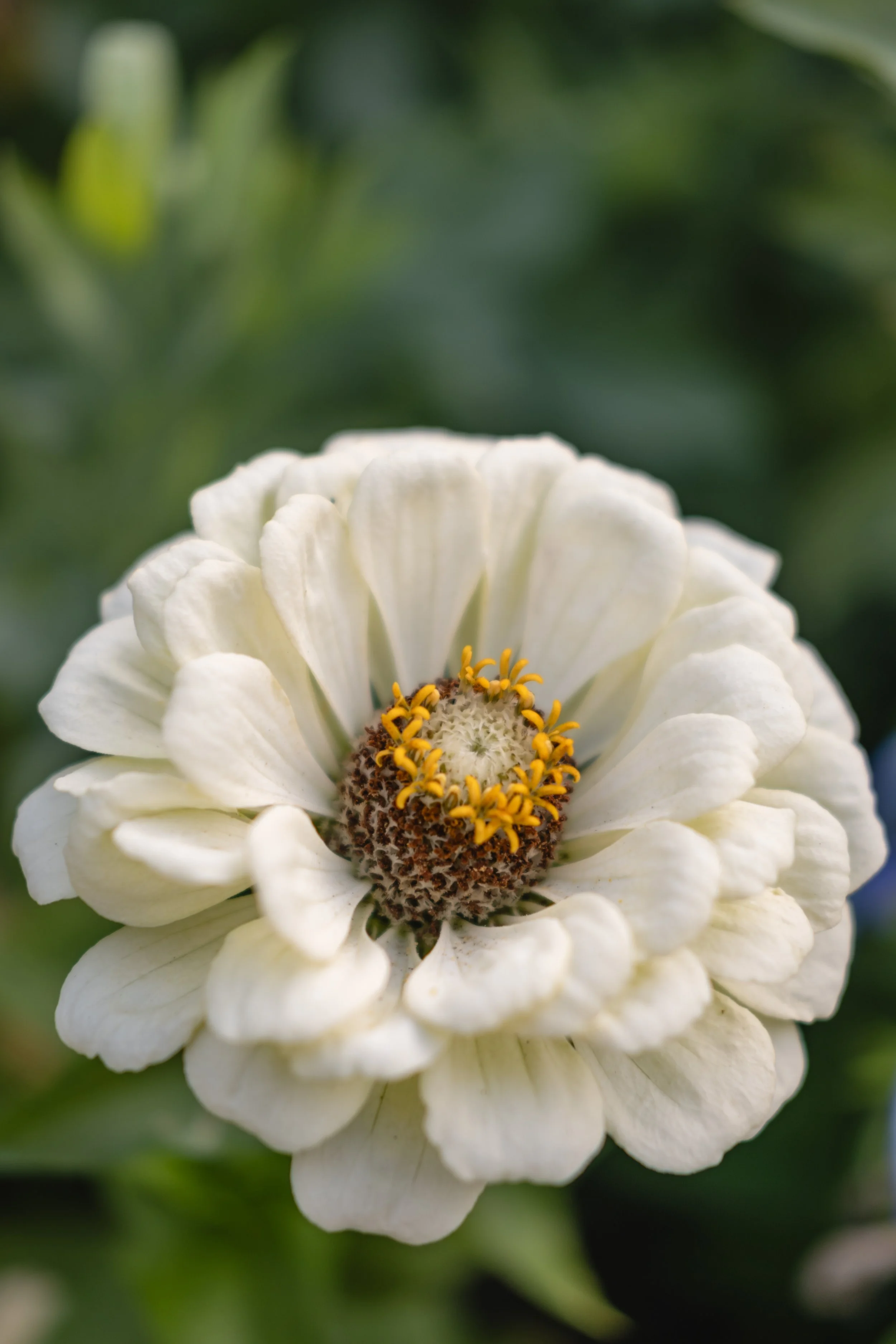 Closeup of a many-petaled white flower with a big, round centre that has tiny yellow petals forming a crown around the middle.