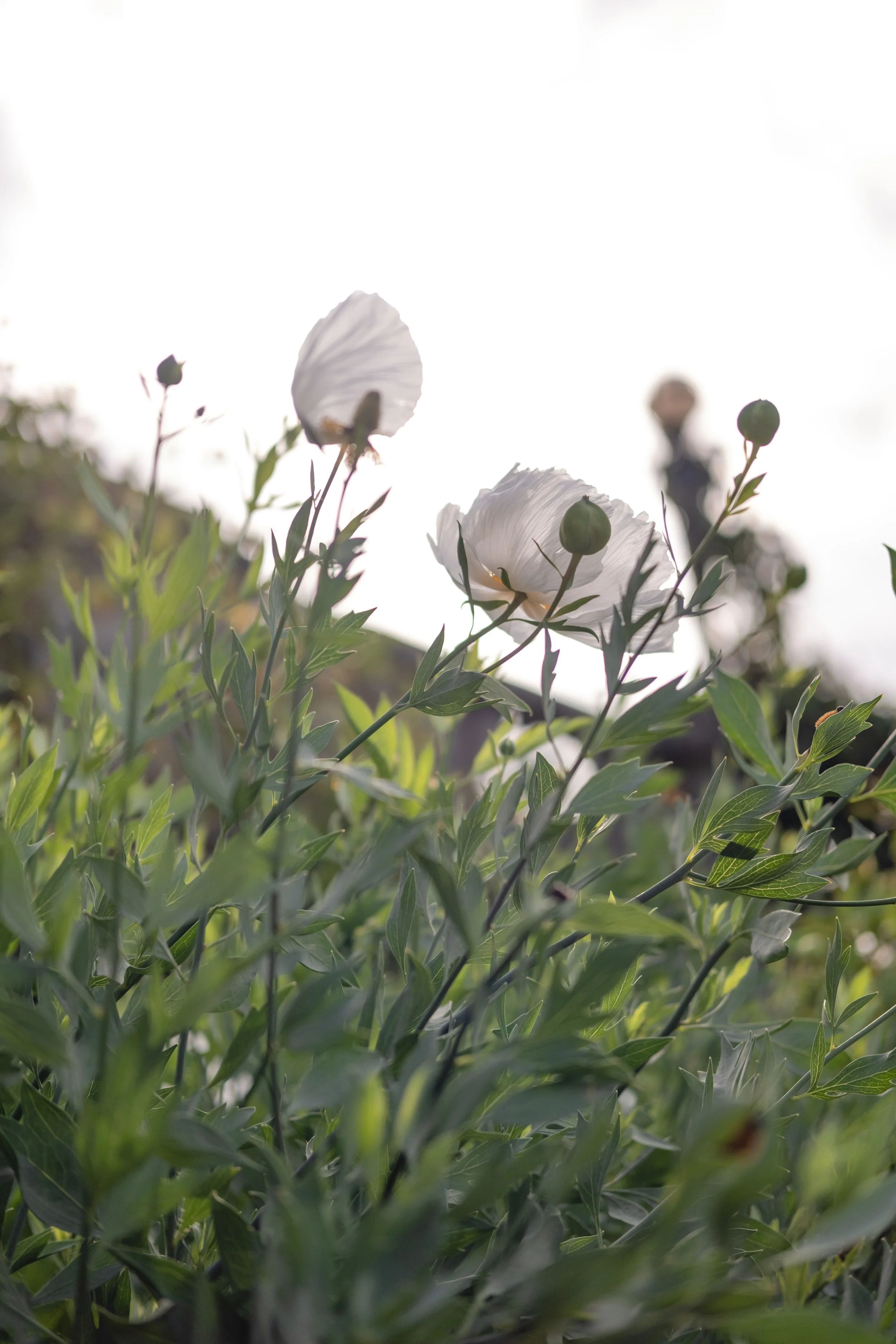 A hazy view of white poppies and their leaves blowing in the wind on a bright day.