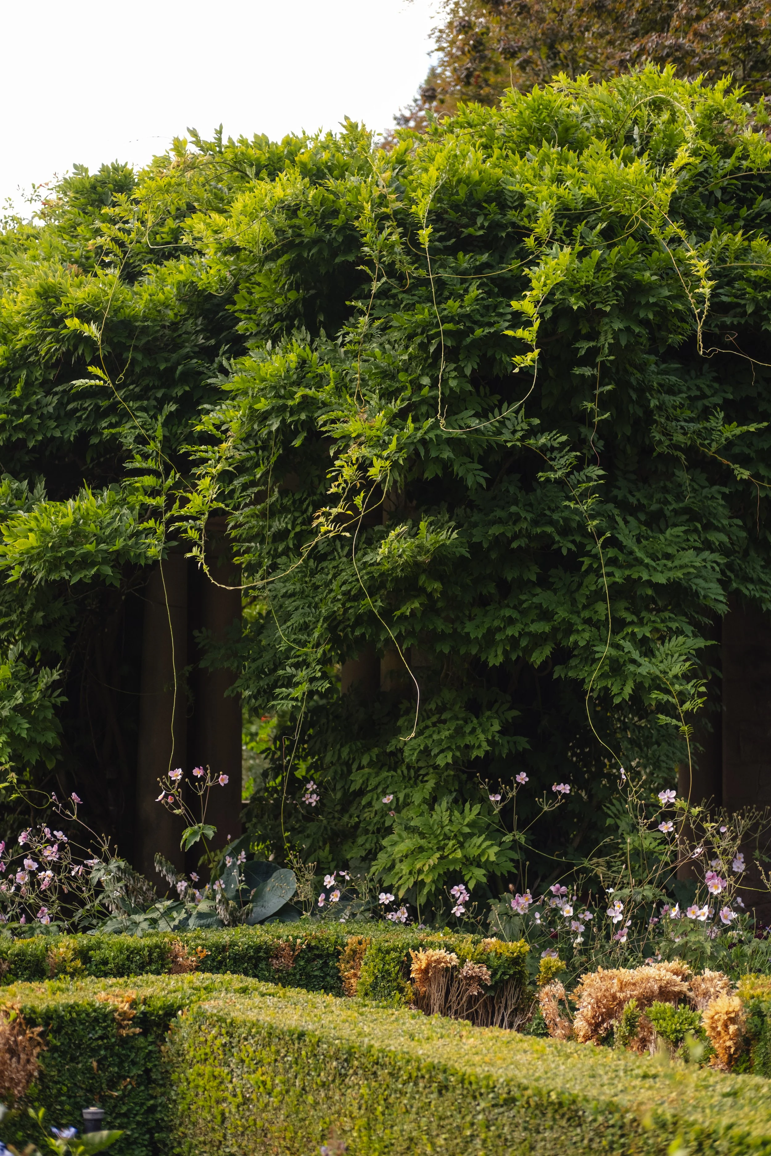 Rich, lush vines drape over square-cut hedges and small pink flowers.