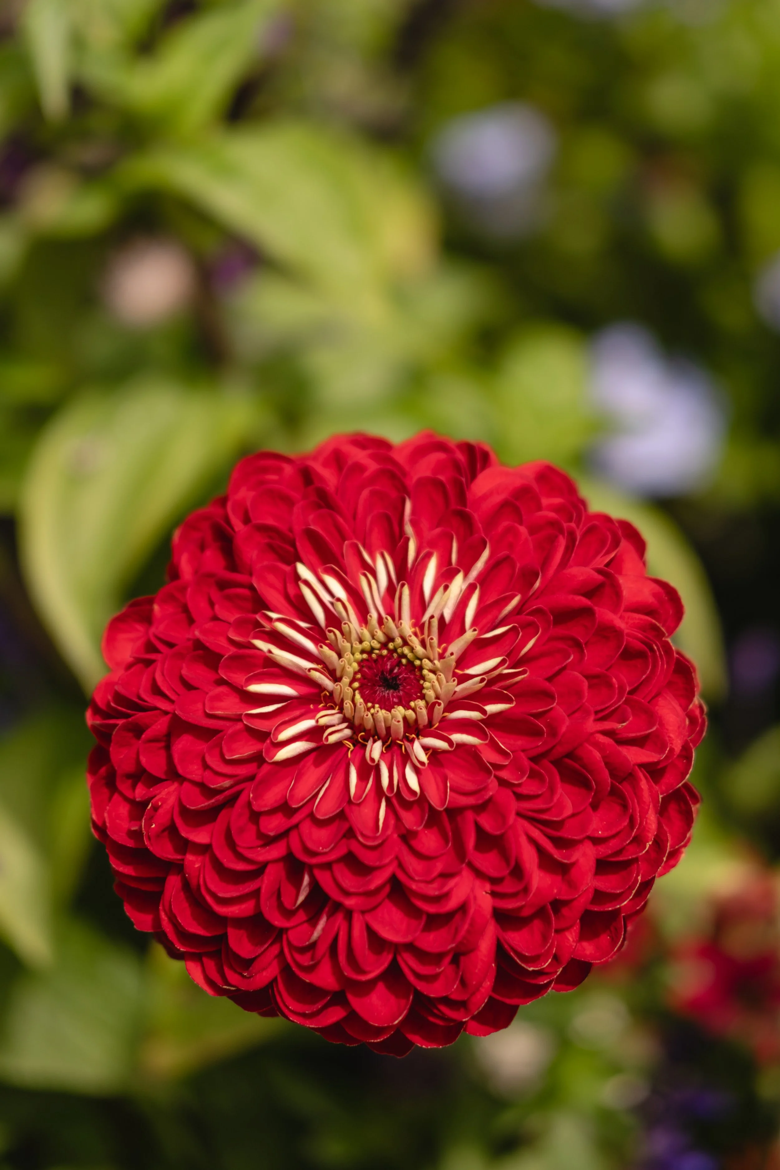 Closeup of a brilliant round, red flower with a million petals looking like something very royal.