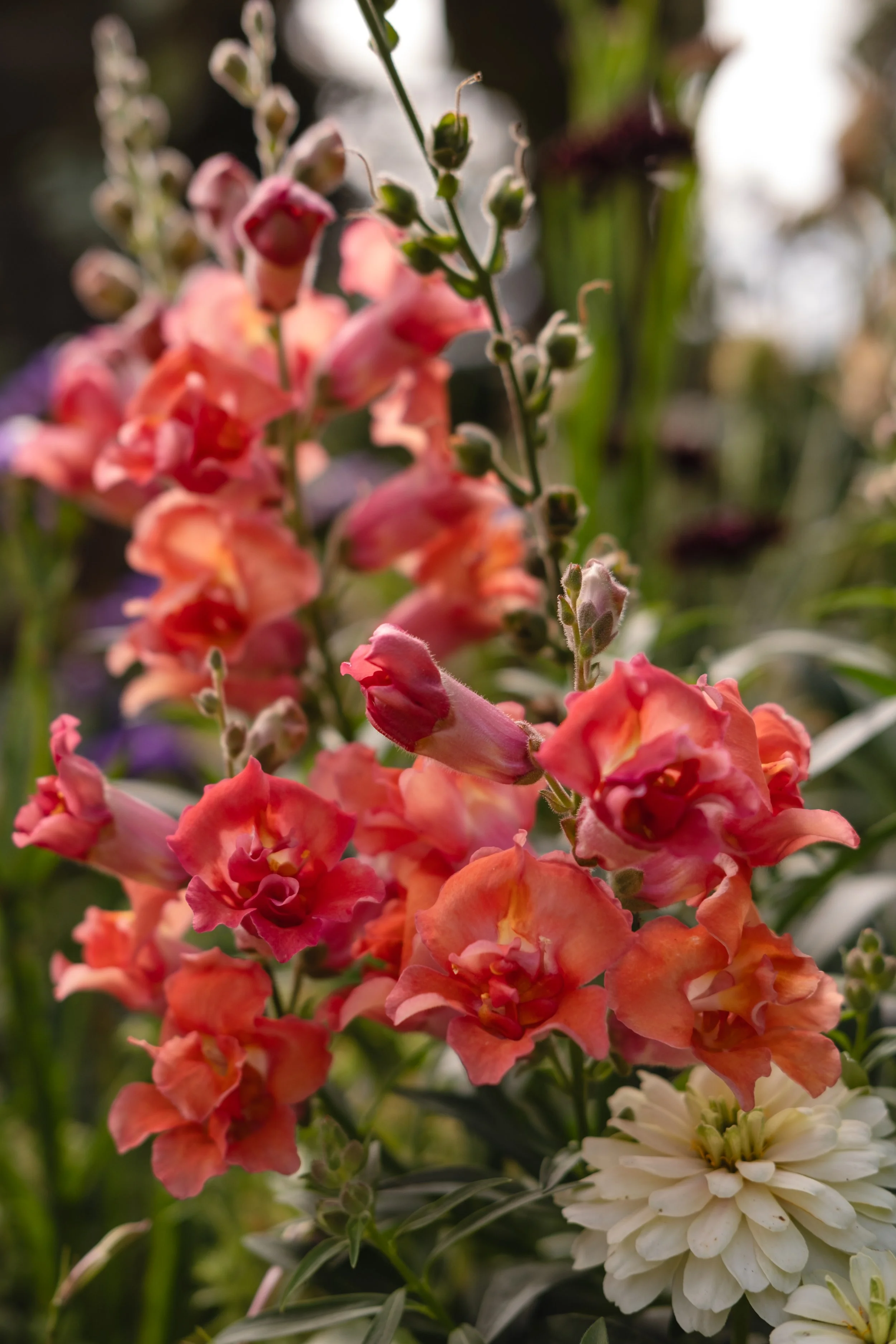 A patch of flowers and leaves in shades of white, pink, purple, and green in a manicured garden.