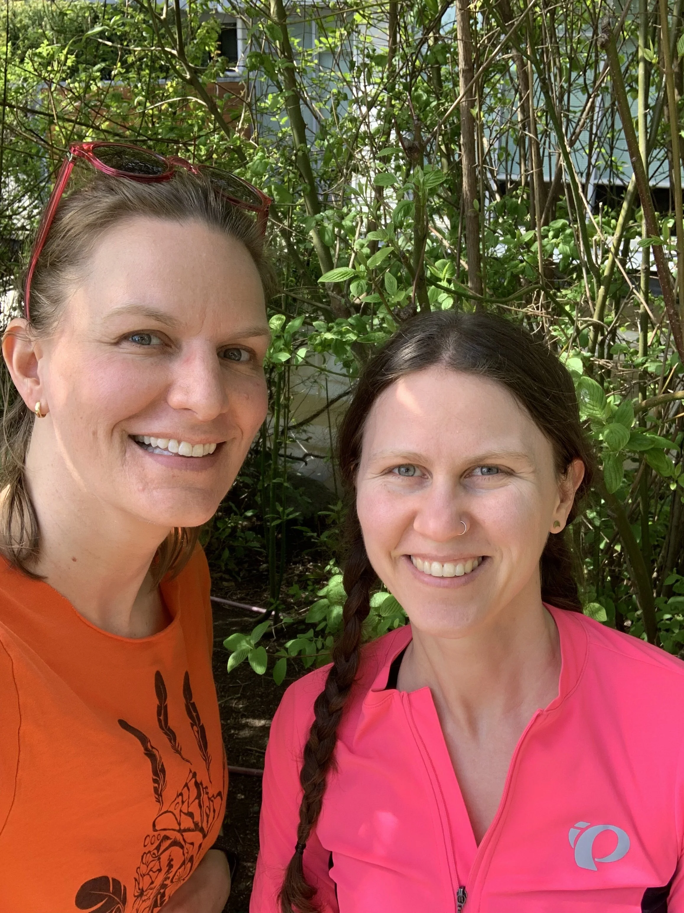 Catherine and Andrea are smiling in bright-coloured shirts in front of a leafy background.