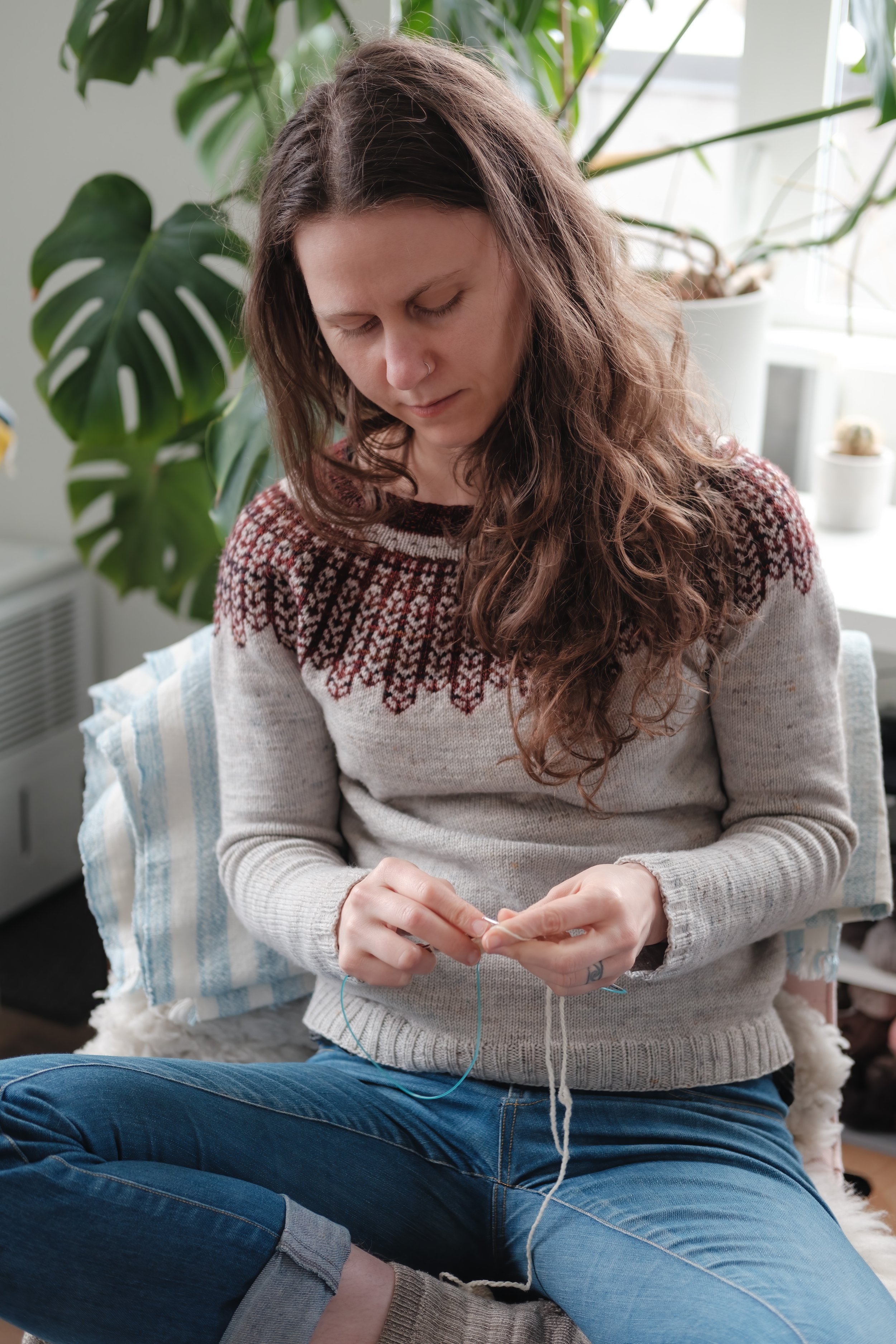 Andrea is sitting cross-legged on a chair knitting with white yarn. She's wearing a grey Dissent sweater with dark read patterning around the yoke.