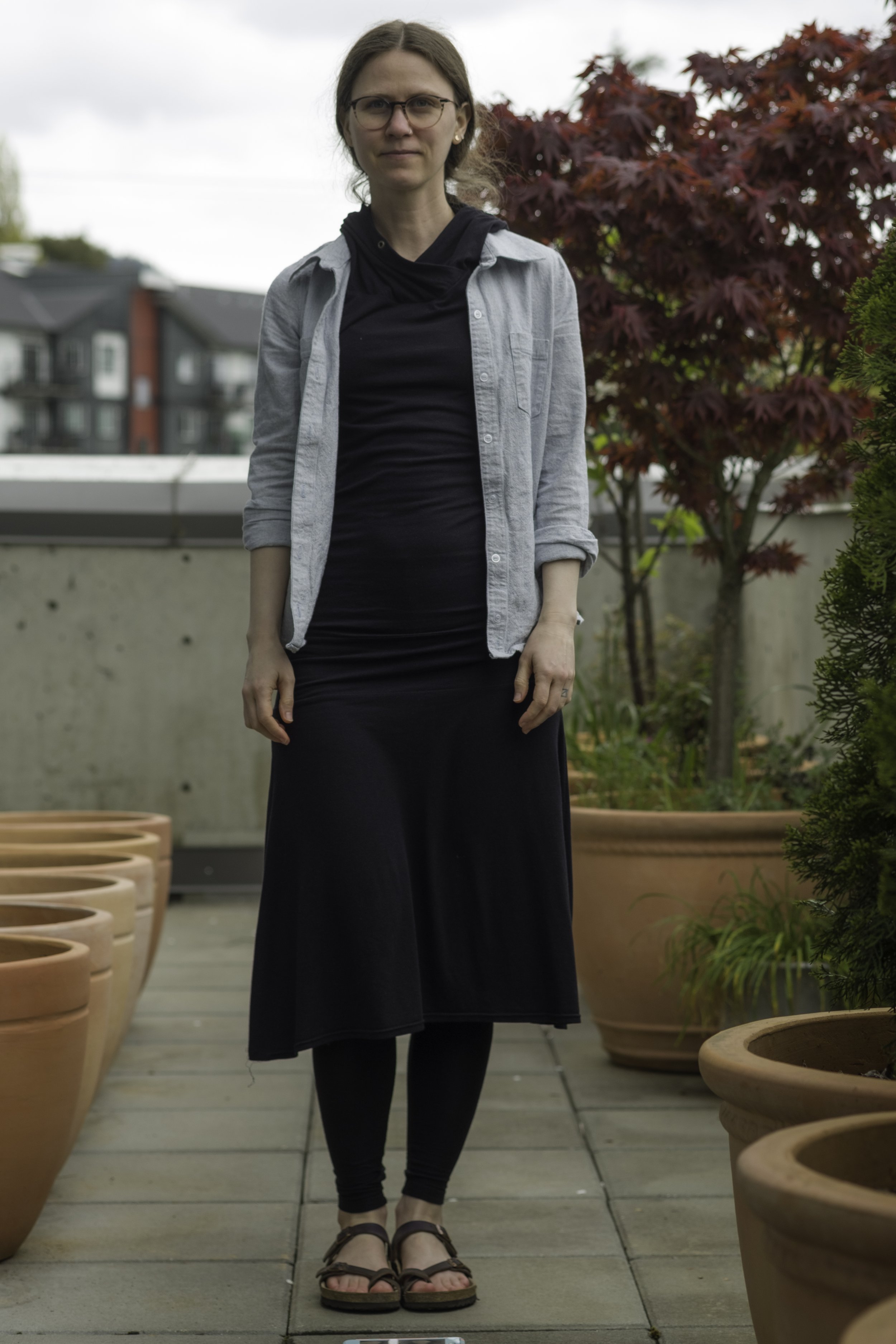 Andrea wearing a chambray button down with sleeves rolled up over a hooded black dress and leggings.