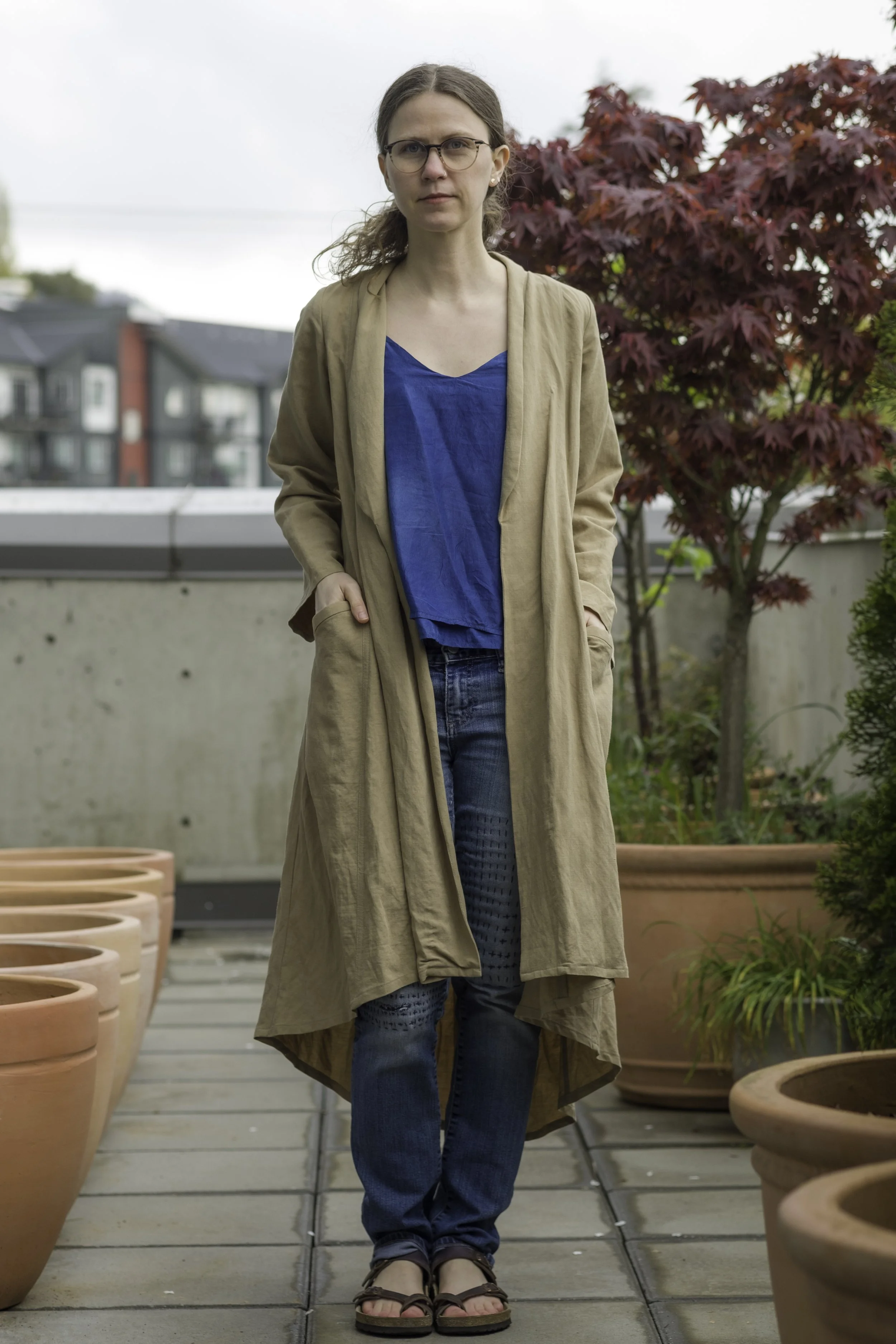 Andrea wearing a long, draping beige duster over jeans and a bright blue tank.