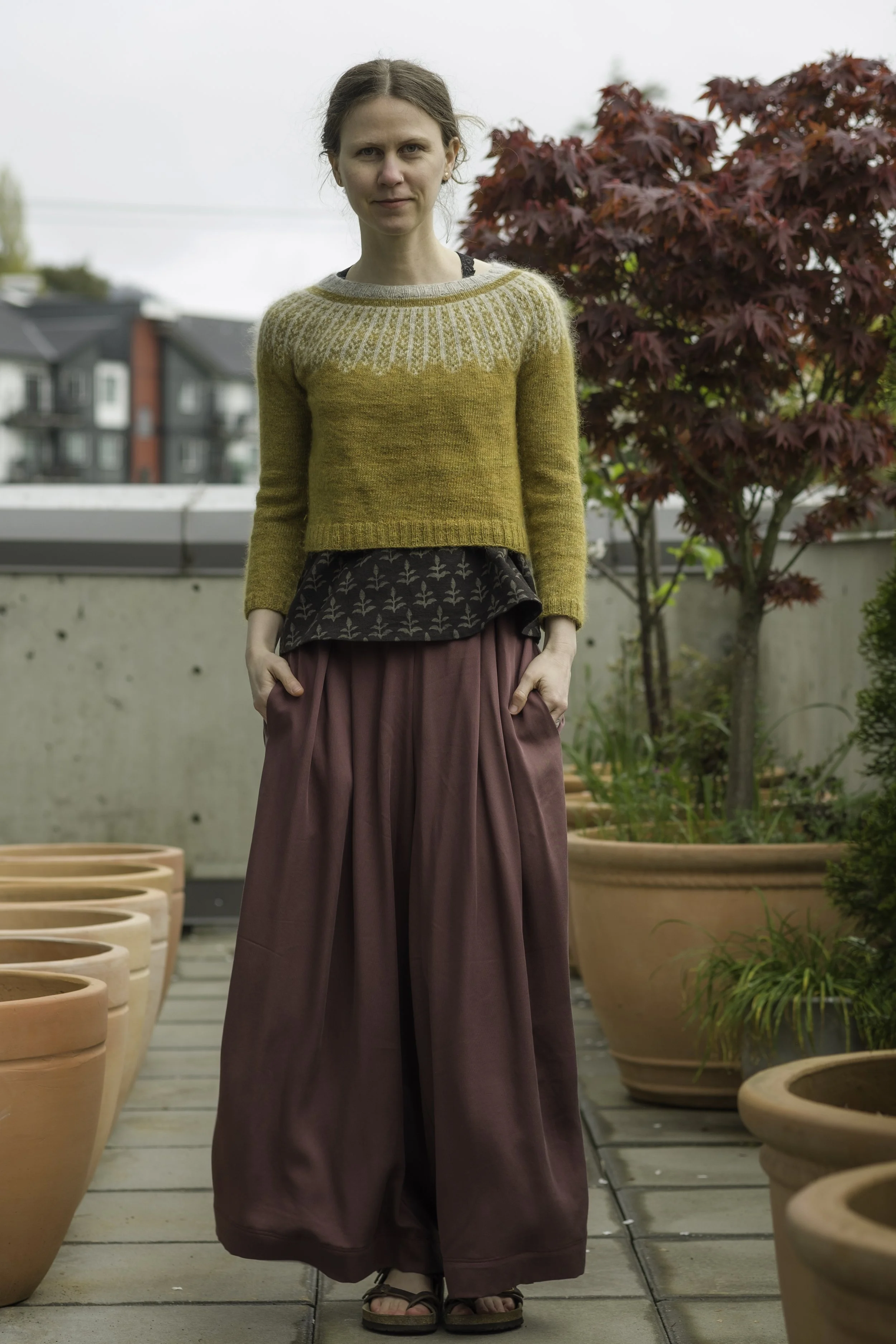 Andrea is wearing a cropped mustard coloured pullover with pale grey patterning at the yoke. The texture is just a tiny bit fluffy. Under the sweater is a black tank top with a grey leaf print. She’s also wearing flowing mauve culottes that match the colour of leaves on a tree in the background.