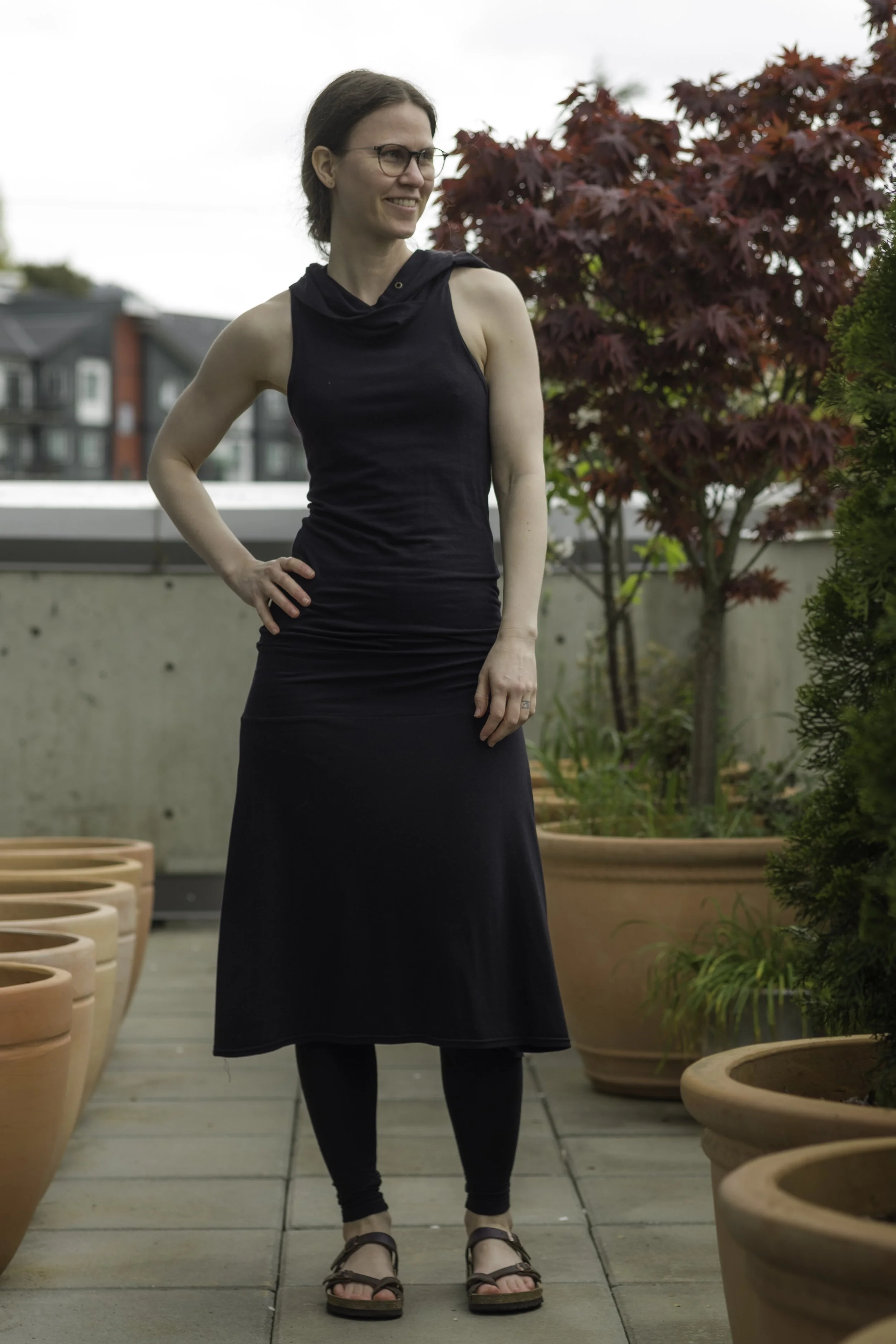 Andrea wearing a black hooded tank dress that’s snug around the bust and waist, and flared around the hips, with black leggings and sandals.