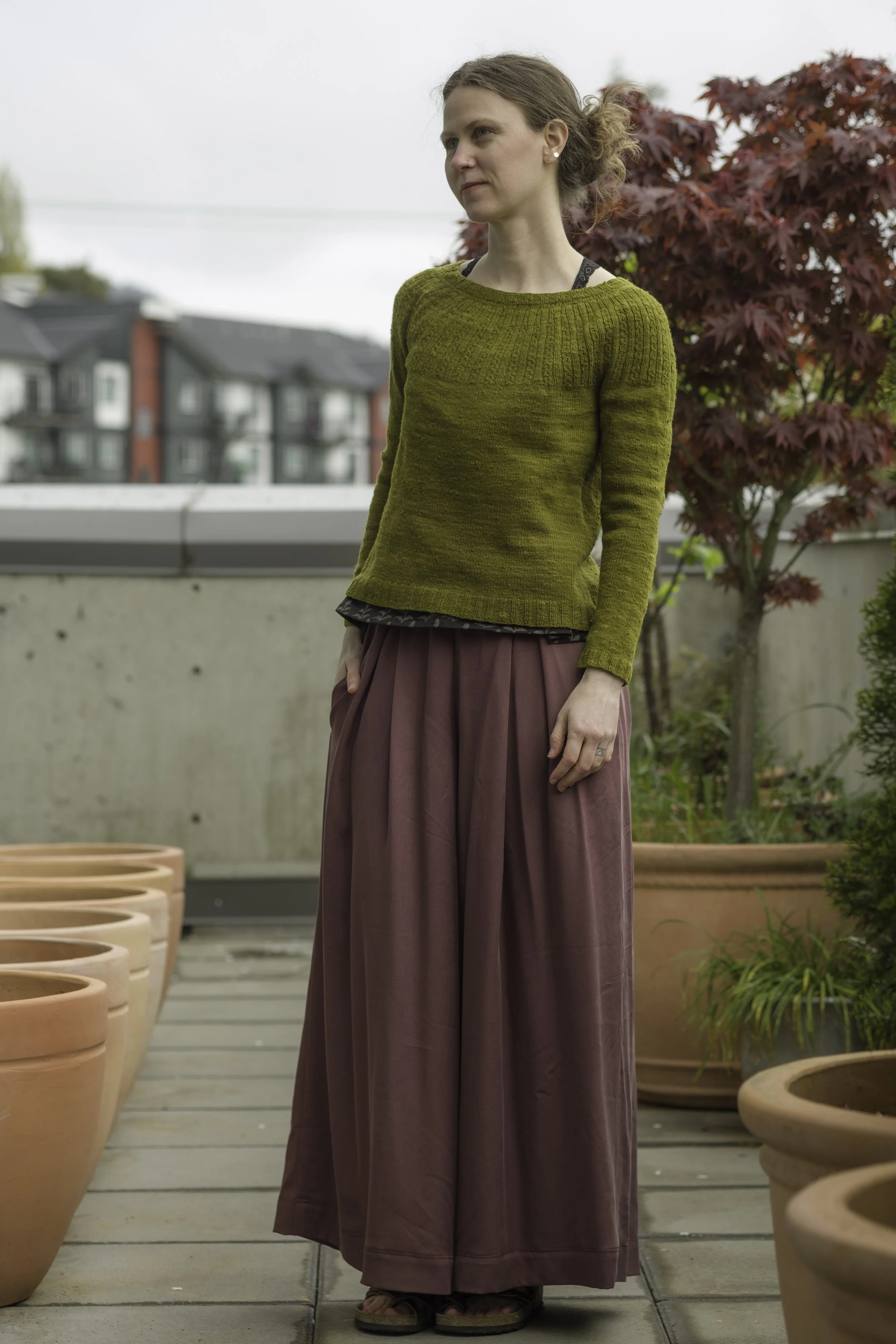 Thoughts: These sweaters have just the right combo of interesting and basic to work with a lot of outfits. I’ve decided to take the green one as my only sweater when I travel this month. They’re made in fingering weight yarn at a tiny gauge, so it is a lot of knitting, but fingering weight sweaters are so wearable!