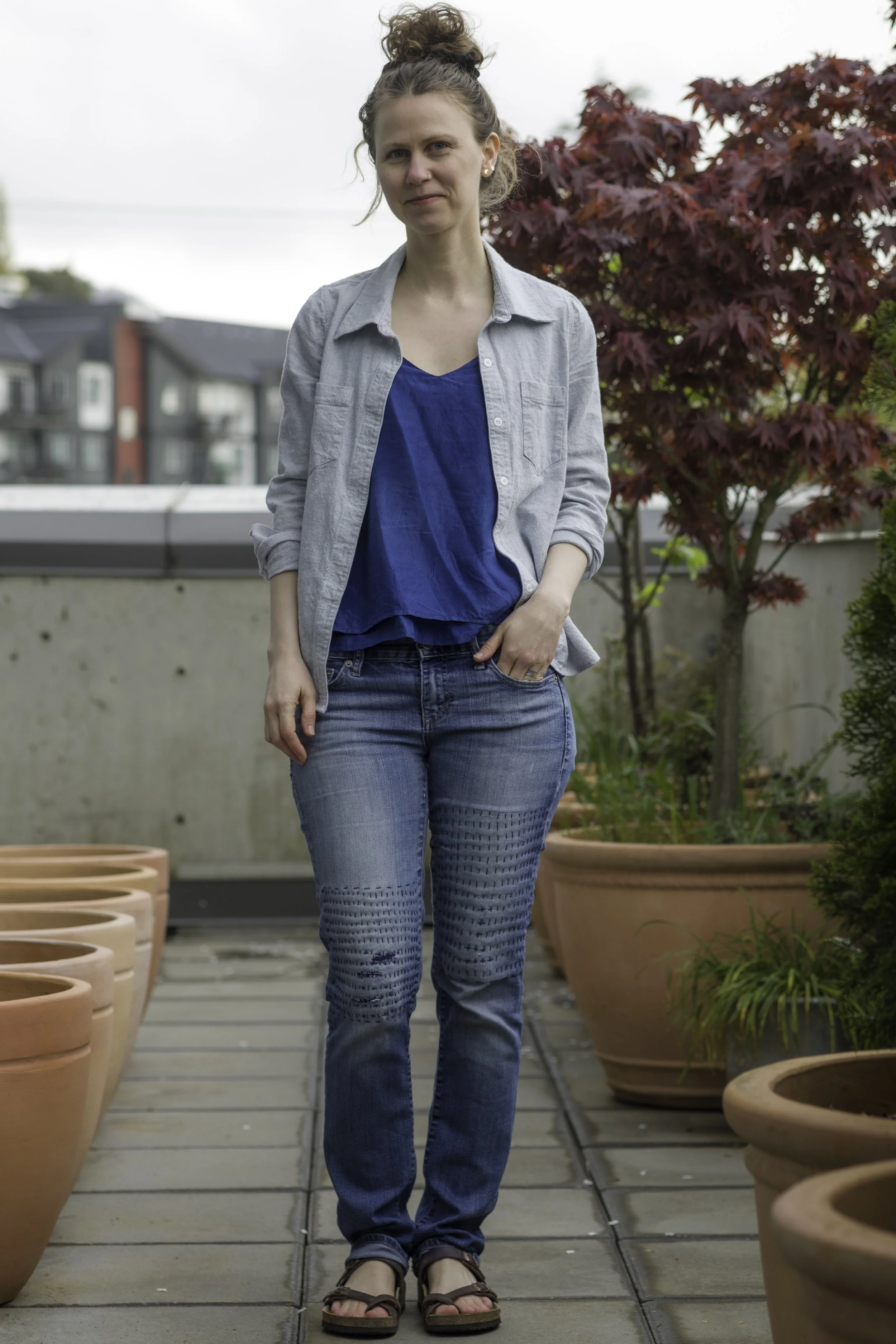 Andrea wearing mended jeans with a bright blue tank under a chambray button down with the sleeves rolled up.