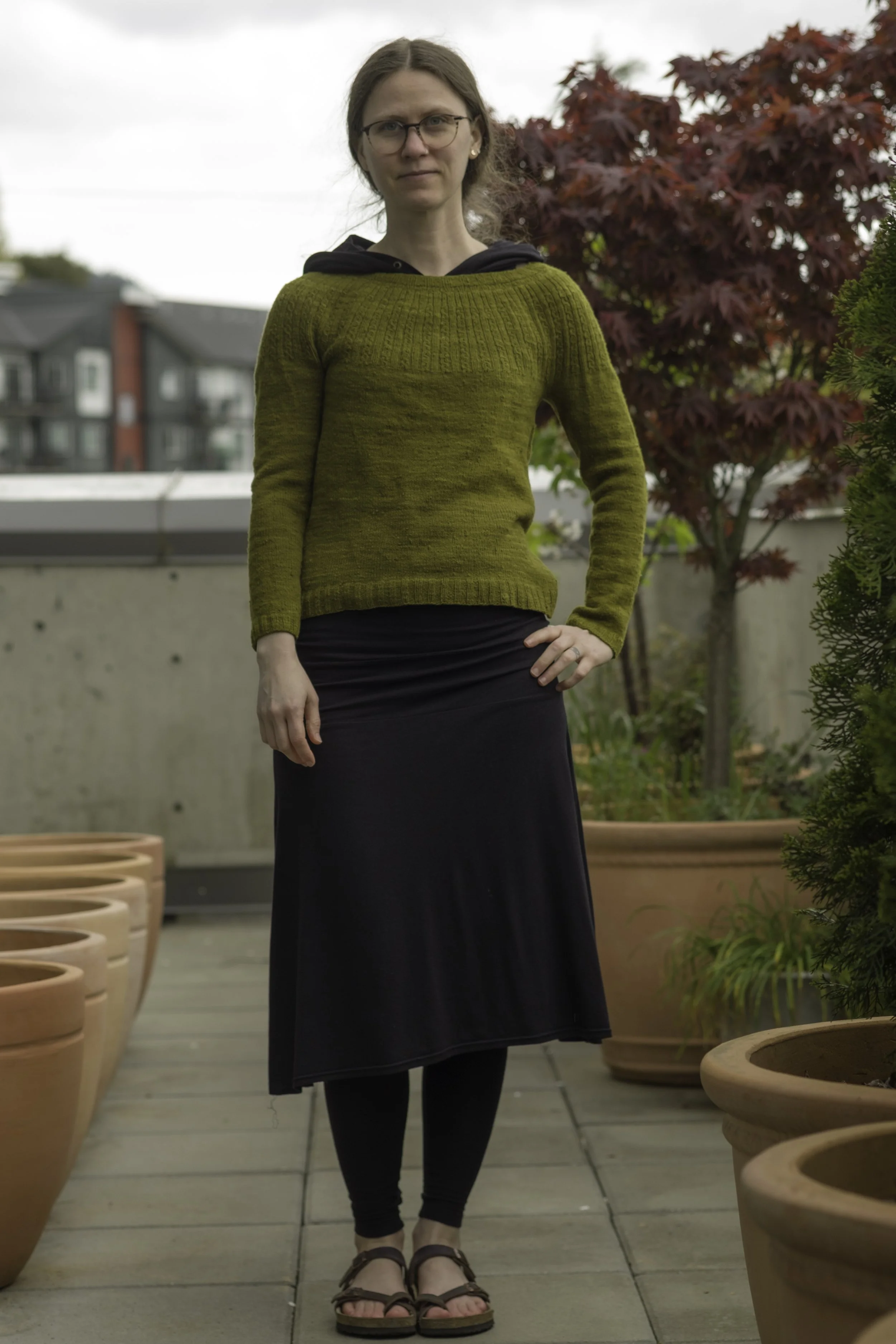 Pattern: Seablush Pullover by me! Both of these are the size 32”, giving me about an inch of positive ease. This is one of my most worn sweaters in both colours, though I do find the regular length green one to be more versatile in my wardrobe than the cropped one.