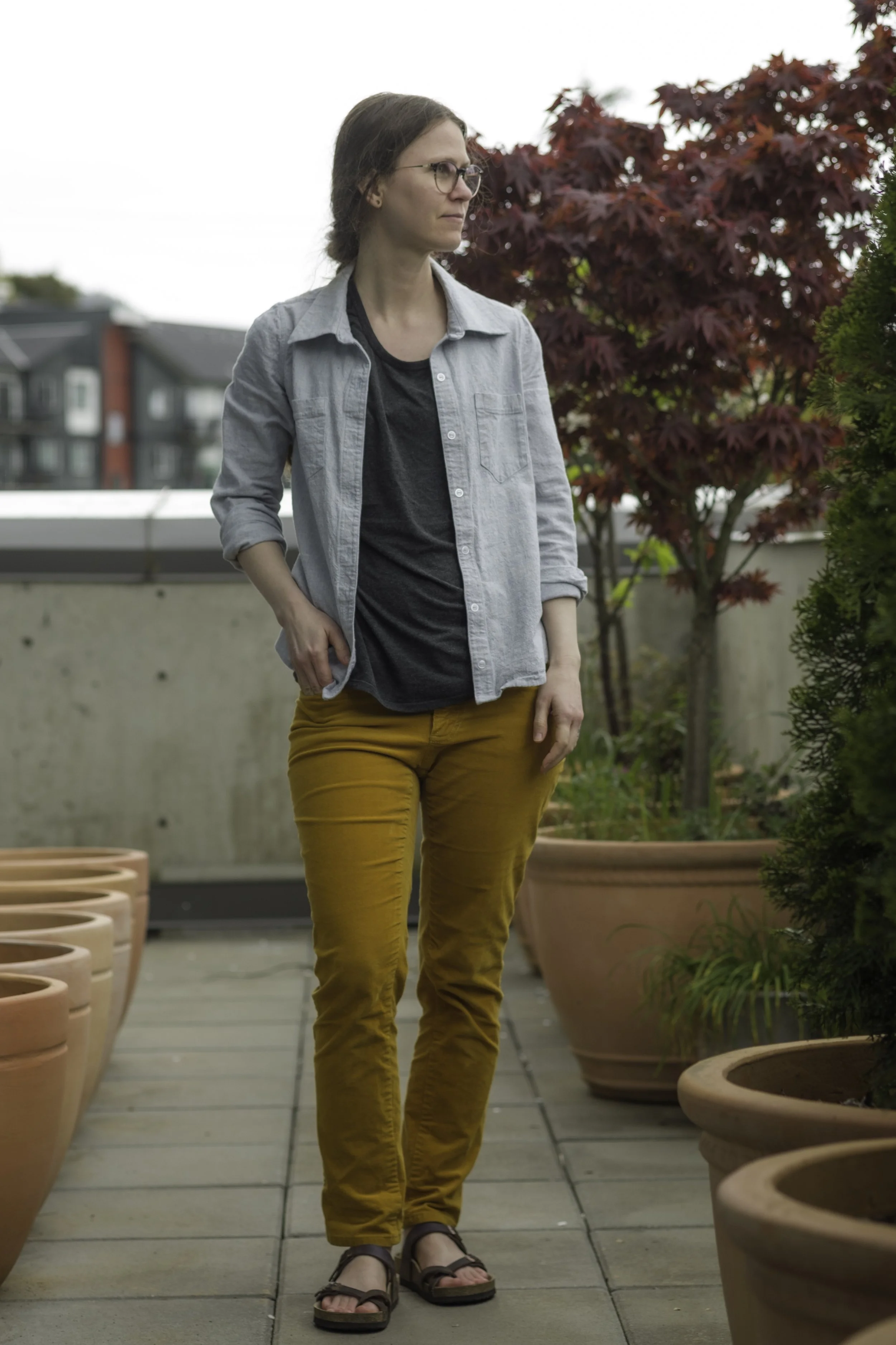 Thoughts: This shirt is just incredibly breezy. It’s also convenient that the more wrinkled it gets, the better it looks to me. I’ve made one in a dark grey chambray and I have another cut out in a tencel/linen blend that’s extra long to be more like a tunic. I like how this shirt is oversized with drop sleeves, but that makes it have a very distinct look from my other button-downs and I think I need both styles in my wardrobe.
