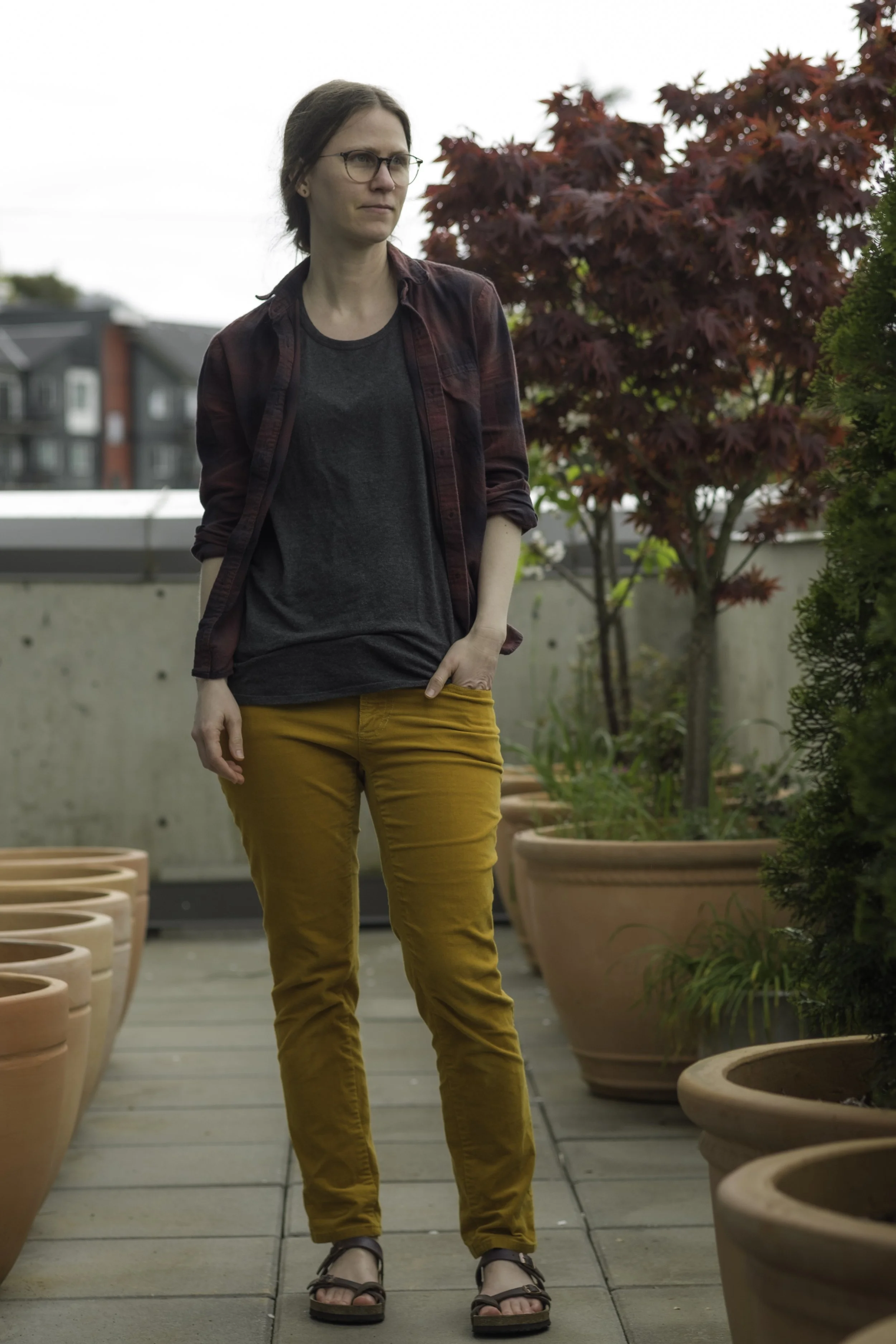 The look is a muscle tank, snug, jeans-style pants, and a button-down. The photos below all show the same tank and the same pants, but I have two other pairs of pants that give the same vibe and three other colours of that muscle tank, so I can easily get dressed and know I’ll be happy with a combo of any of those tanks, pants, and button-downs.