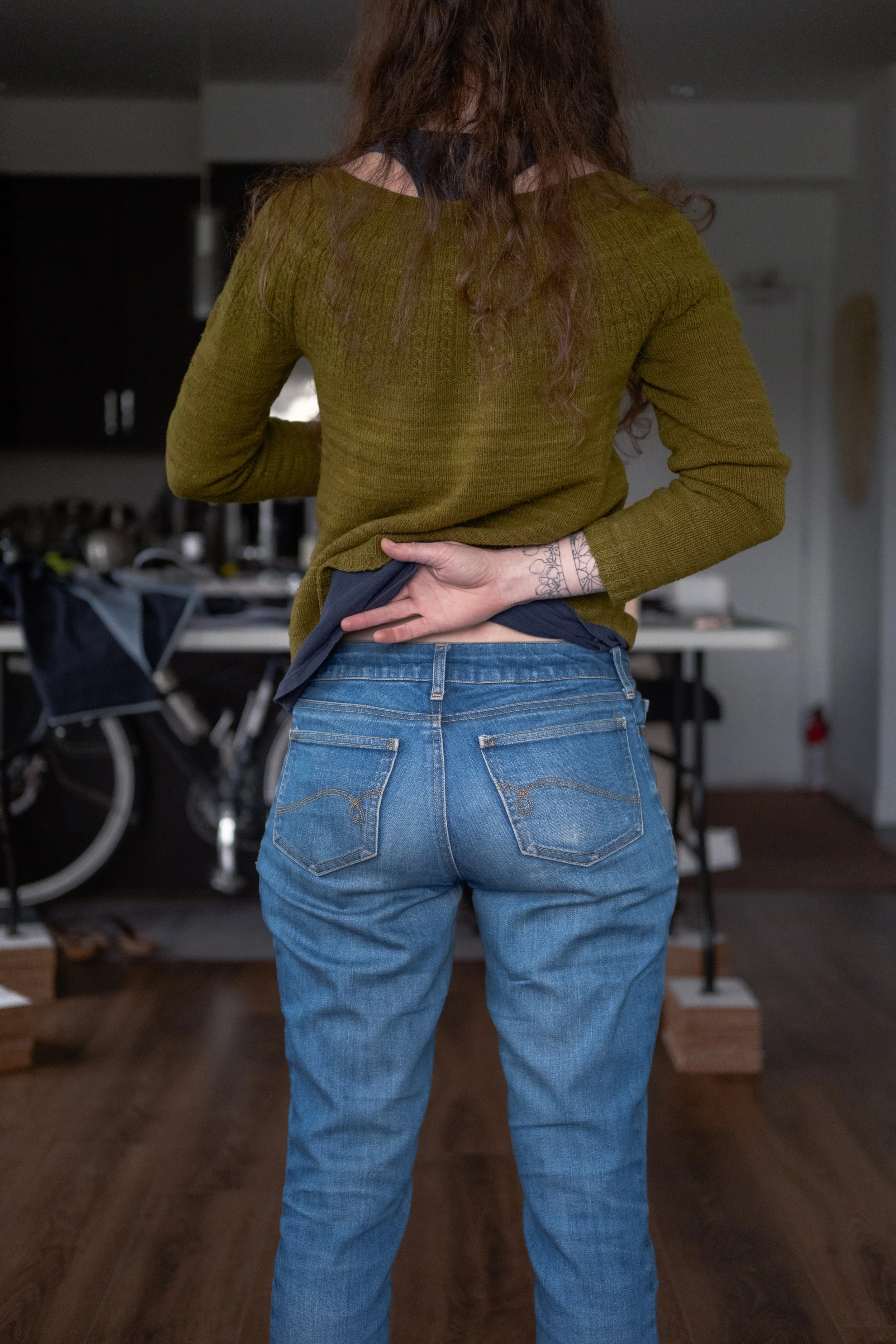 These photos aren’t really to compare and say how much better the new jeans are than the old, more to just contemplate their differences. When my Ginger jeans were new, I think they fit me a lot better, or rather, more how I wanted. But over time, my body has changed shape and the fabric, which is stretch denim, has probably stretched out a little too. It’s pretty delightful to me that even though my shape has changed, I have a reliable (if labour-intensive) way to have clothes that look how I want.