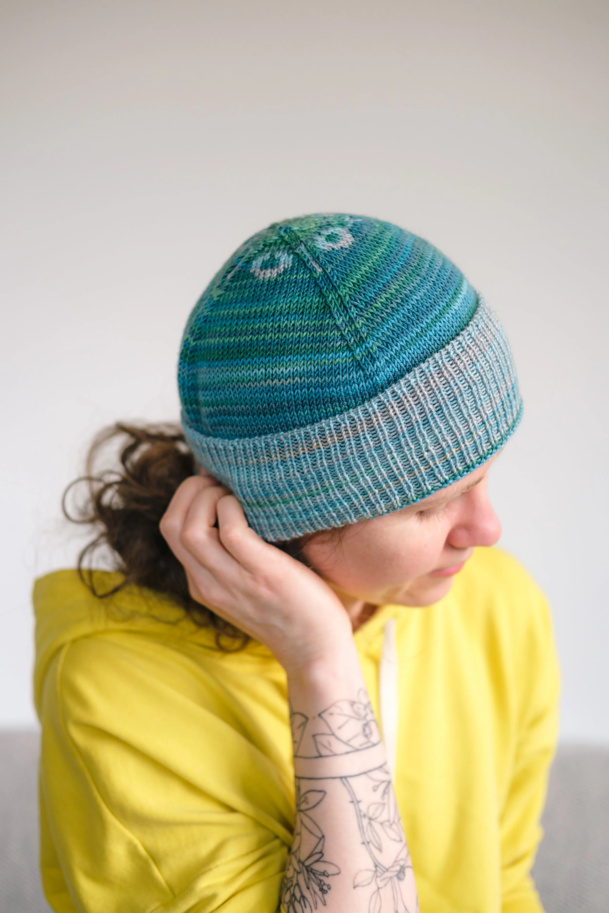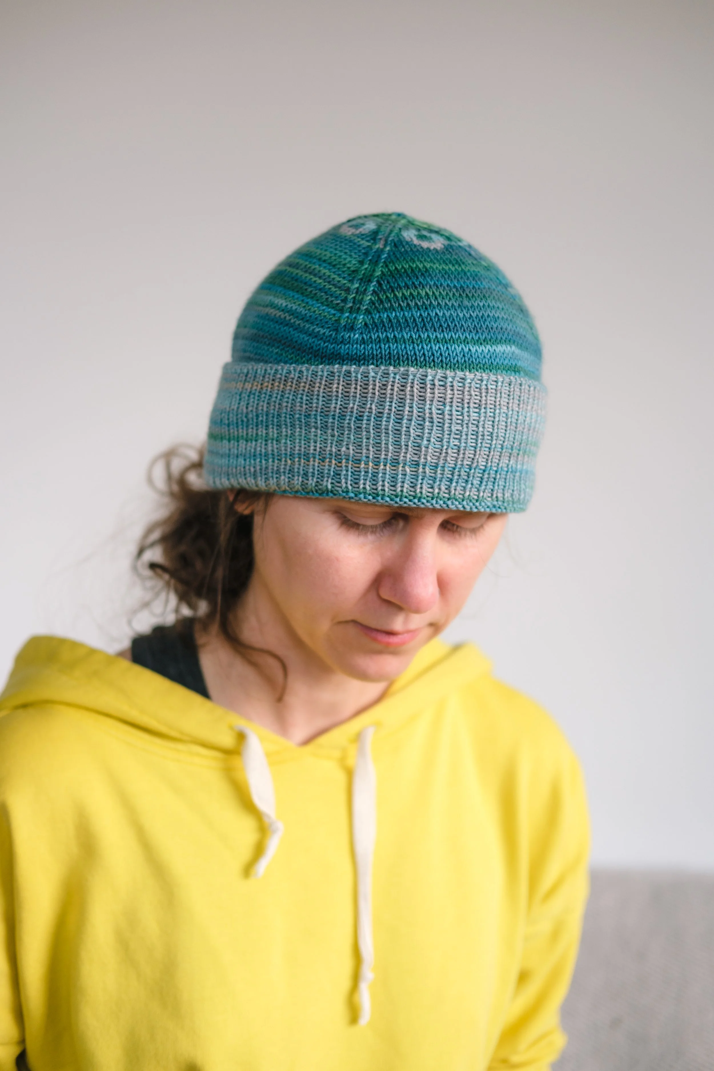 Andrea’s wearing a gradient blue and teal toque with a turned up ribbed brim and jellyfish-inspired colourwork at the crown.