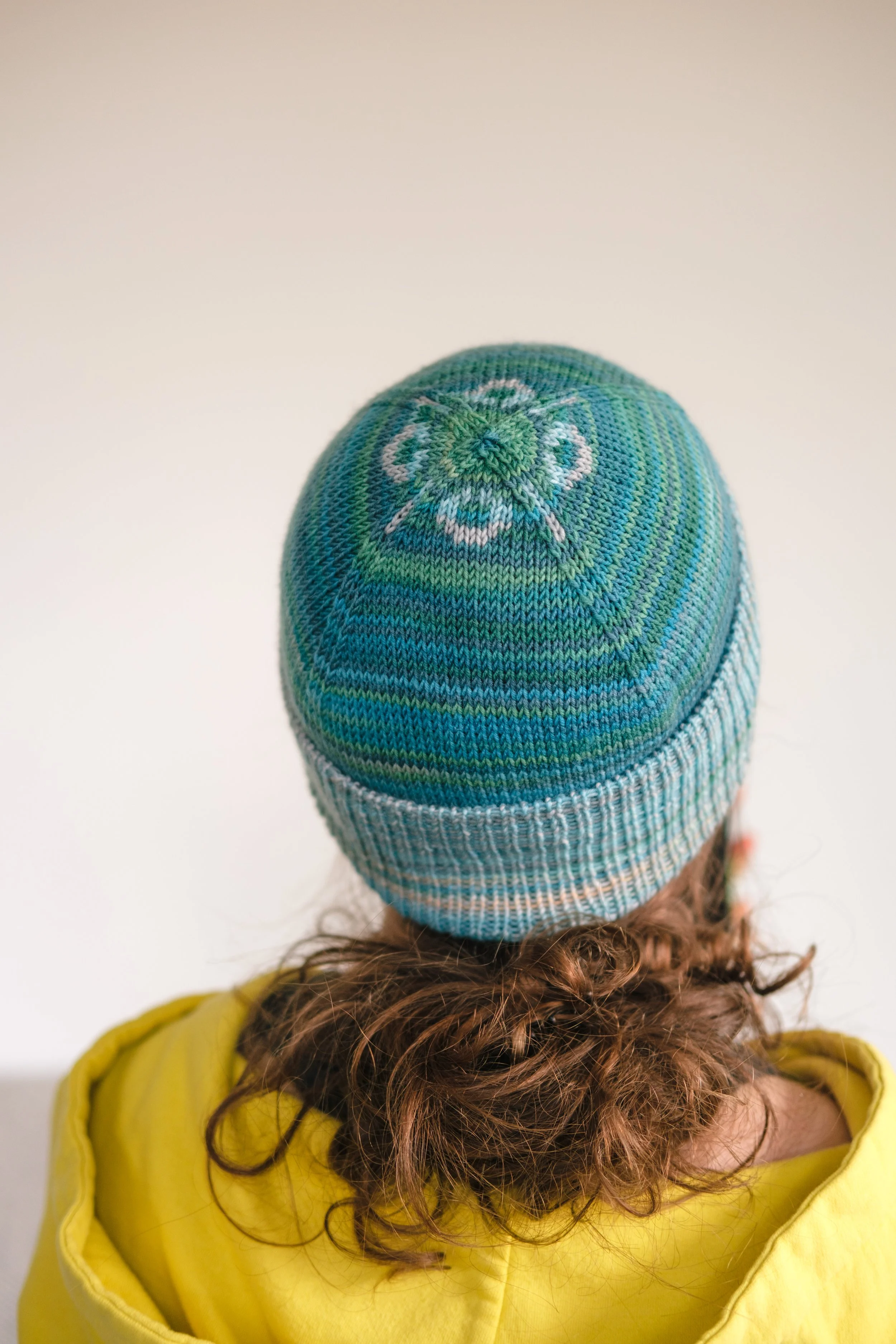 The back of Andrea’s head wearing a gradient teal toque. On display are the square crown shaping and four circular colourwork motifs around the crown.
