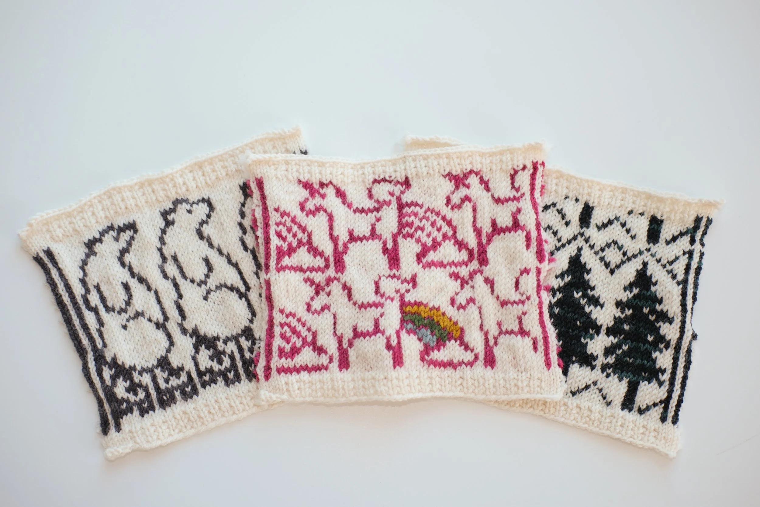 Three colourful knitted swatches on a white background. On the left, polar bears are upright on roller skates, in the middle, unicorns are farting rainbows, and on the right, evergreen trees are in front of mountains.