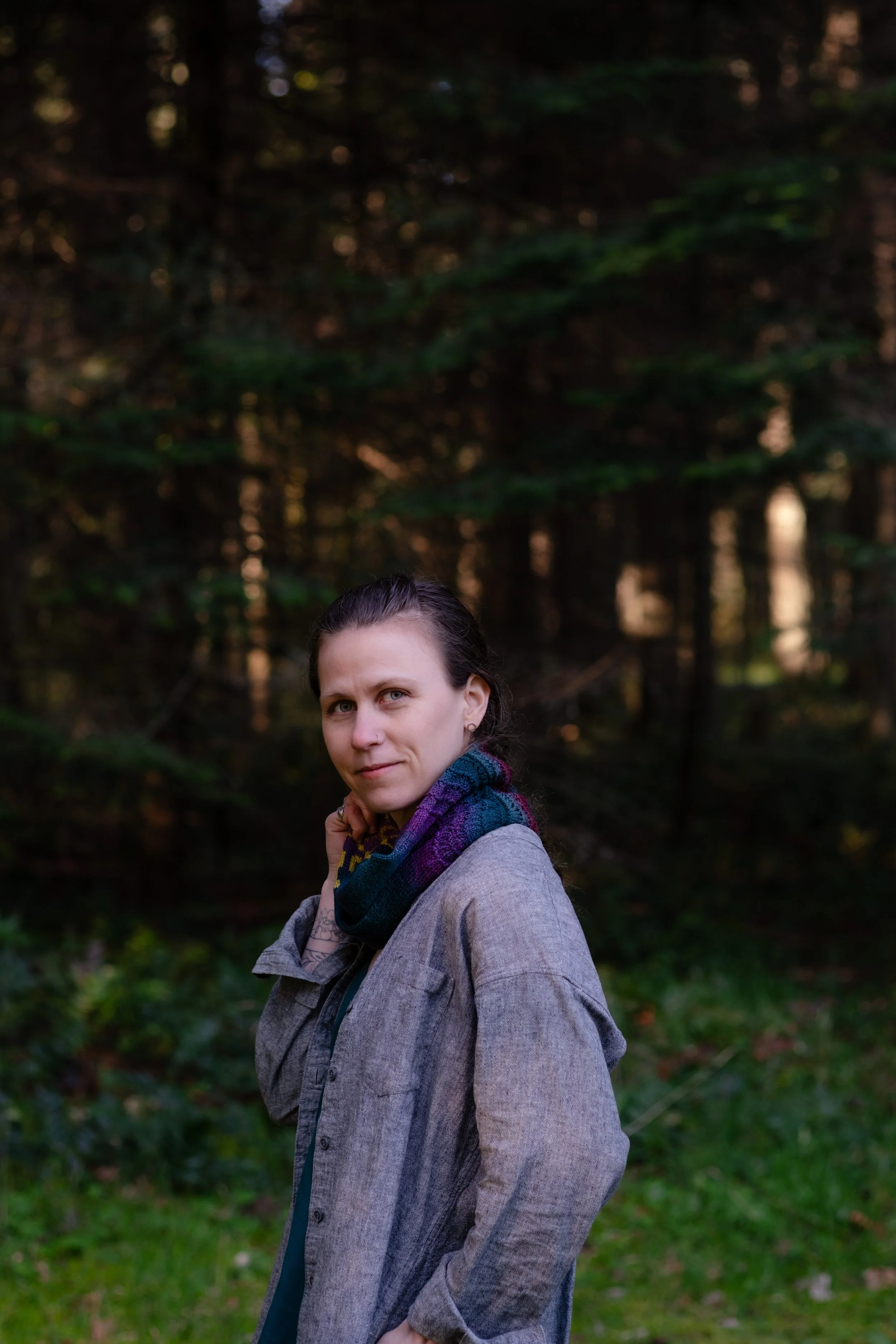 Andrea’s profile. She’s wearing a cozy cowl in colours that fade from magenta through teal to dark blue. A hint of golden colourwork is visible.