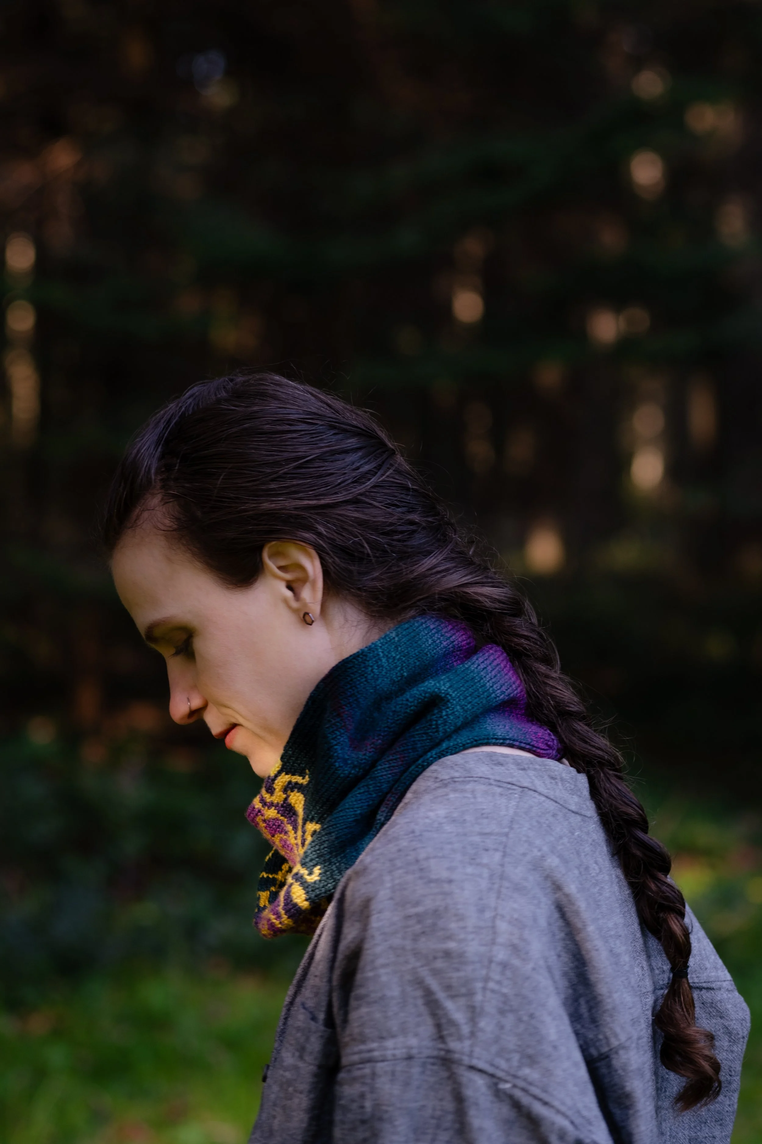 Cowls are just the thing to tuck into your pack for those springtime moments when the sea breeze picks up or the clouds roll in. This one is cozy and bold, with both lace and colourwork, worked with colour-changing yarn — one of those projects that’s so hard to put down because you just need to see what’s going to happen next!
