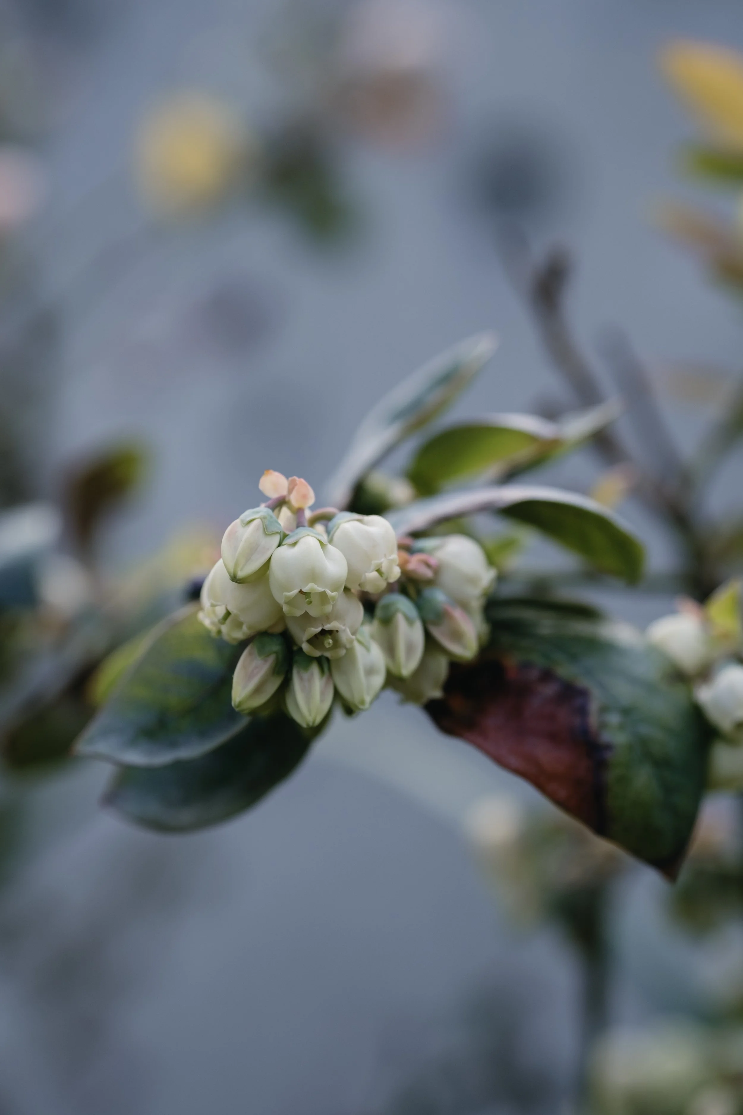 Off white bell-shaped blueberry flowers and buds clustered together in front of green leaves.