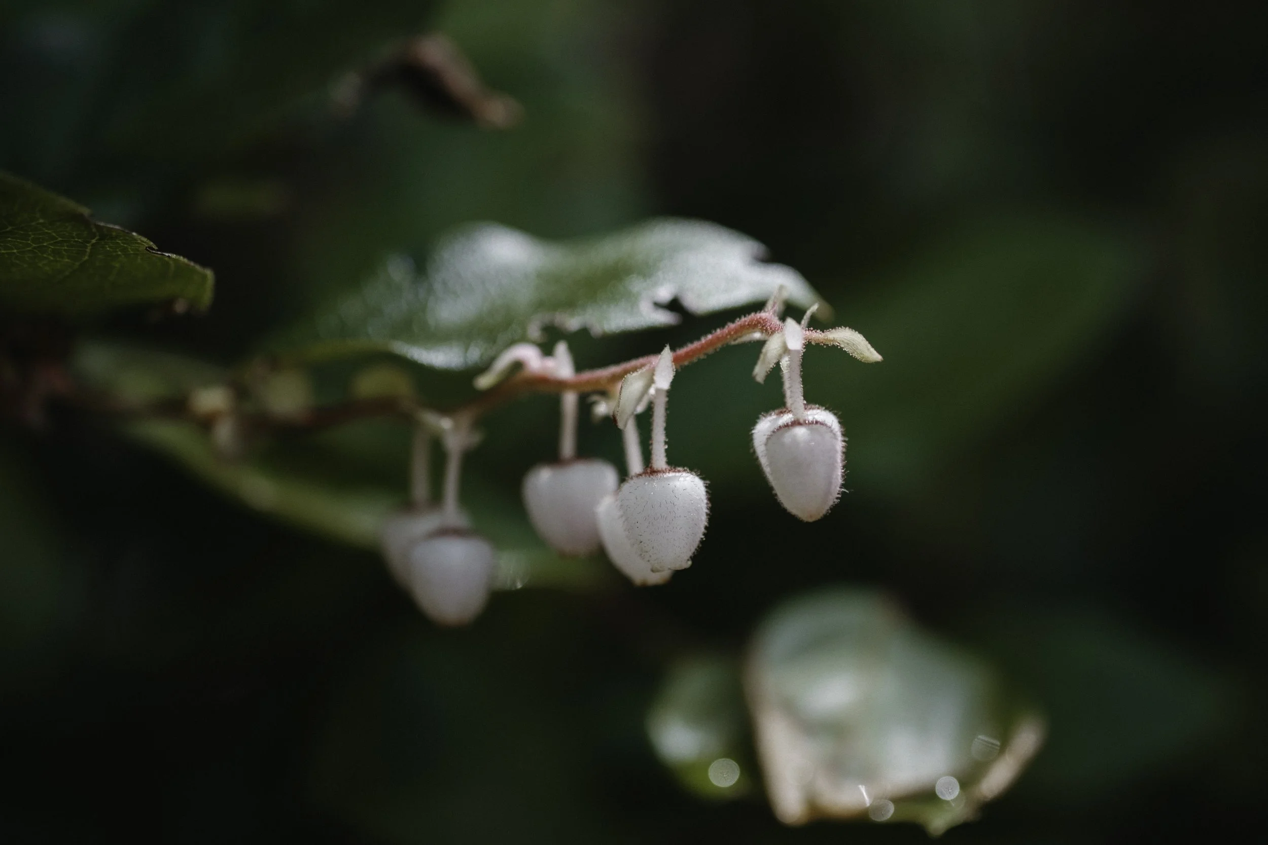 Furry white salal flowers dangling from red stems in front of green leaves.