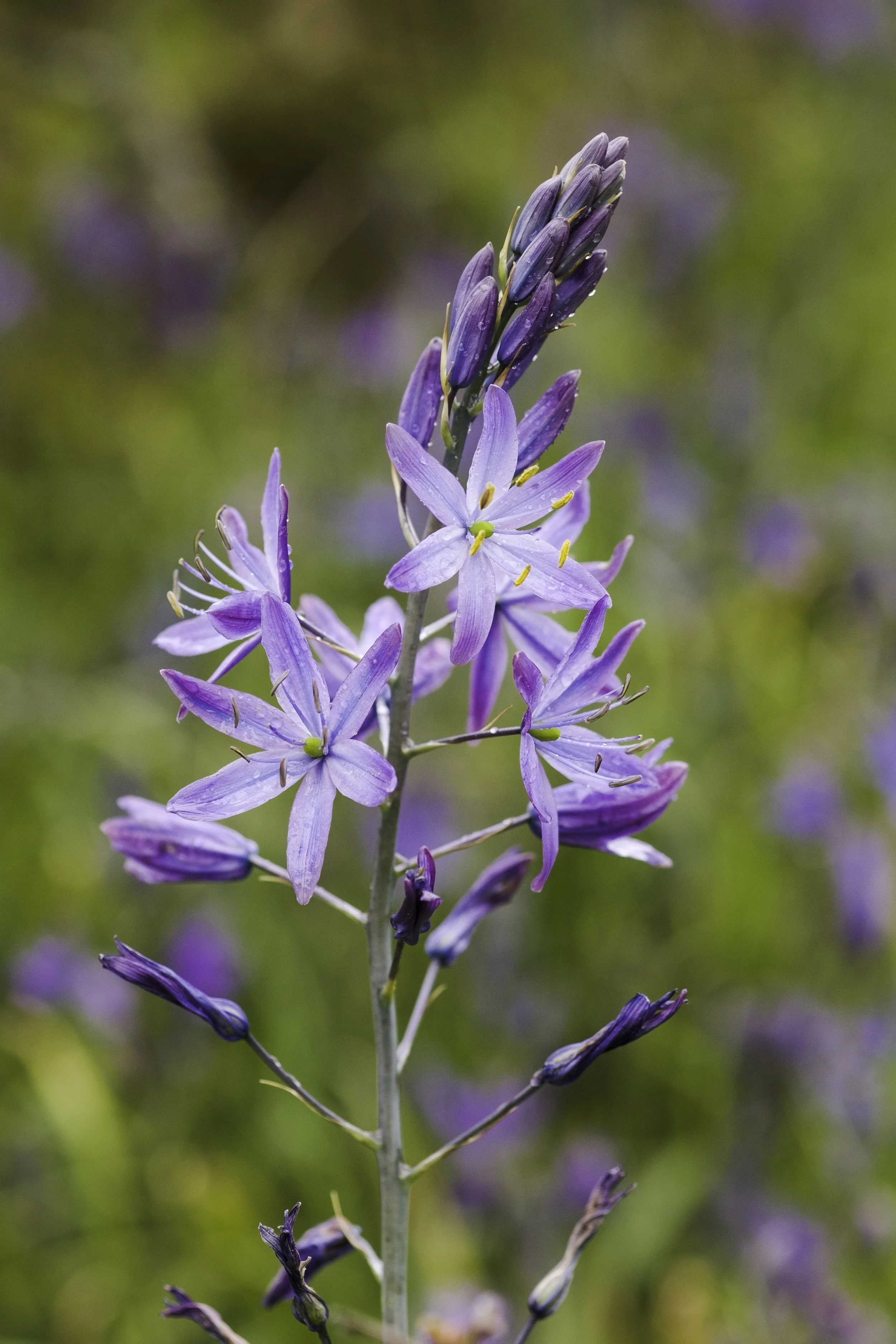 Closeup of a cluster of camas flowers that are a particularly pale, soft lavender colour. There are closed flowers at the bottom of the stalk, wide open ones in the middle, and unopened buds at the top.