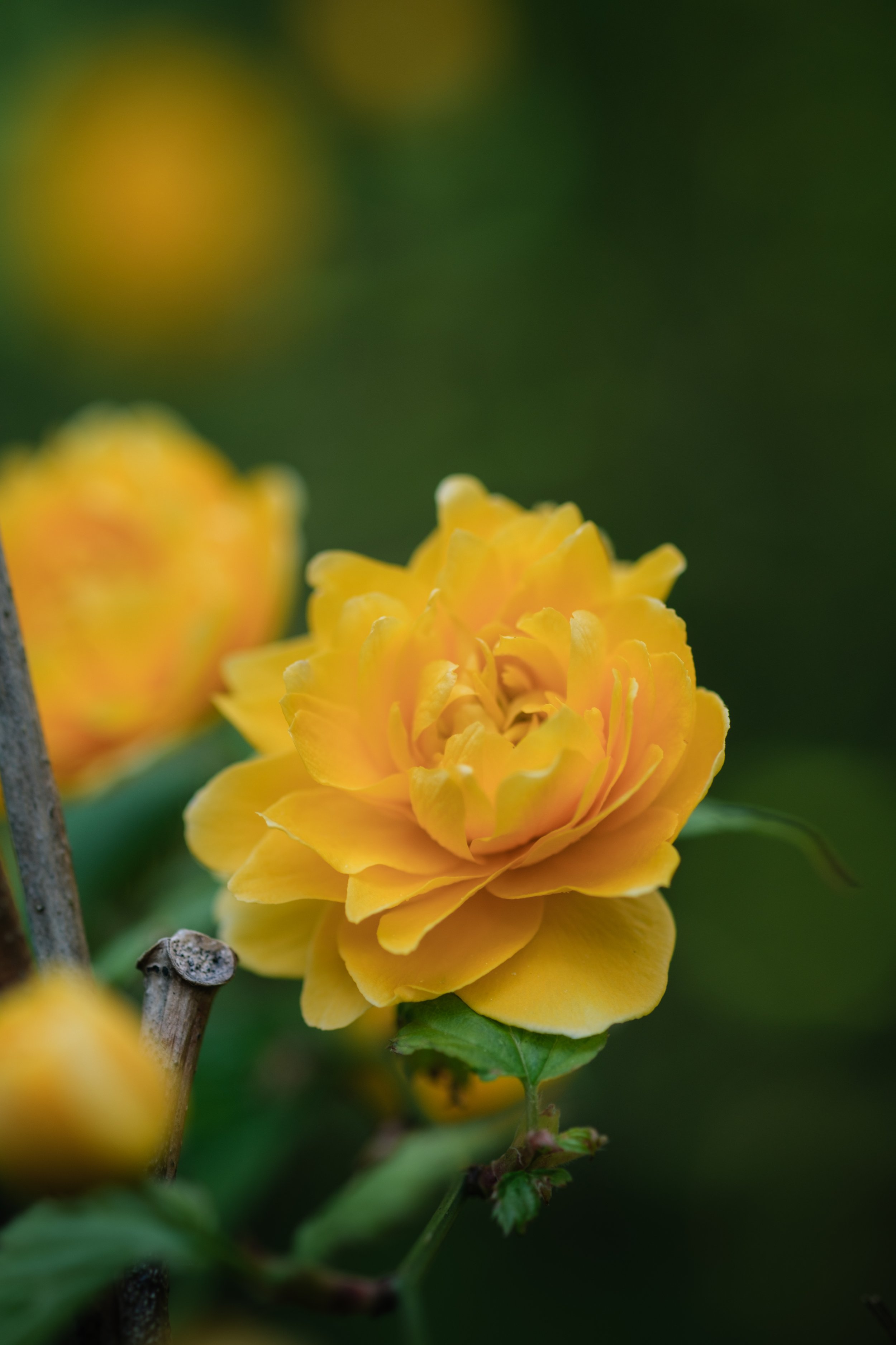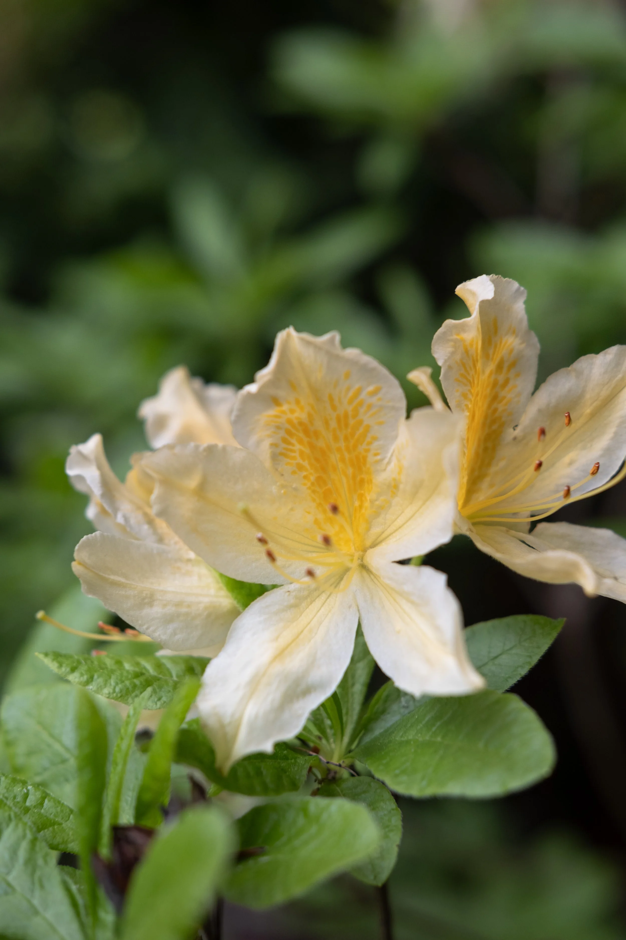 Yellow rhododendrons on a leafy branch.