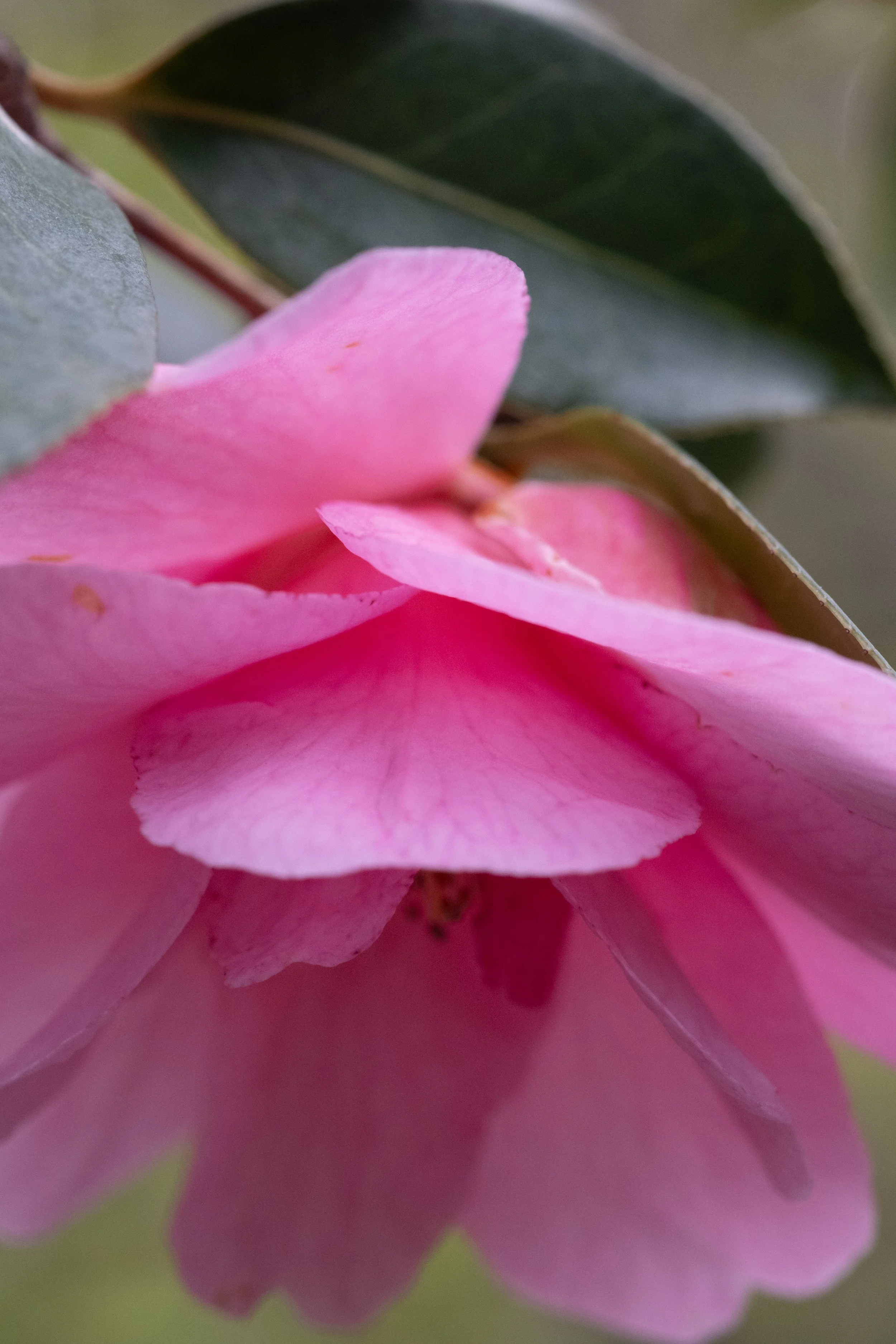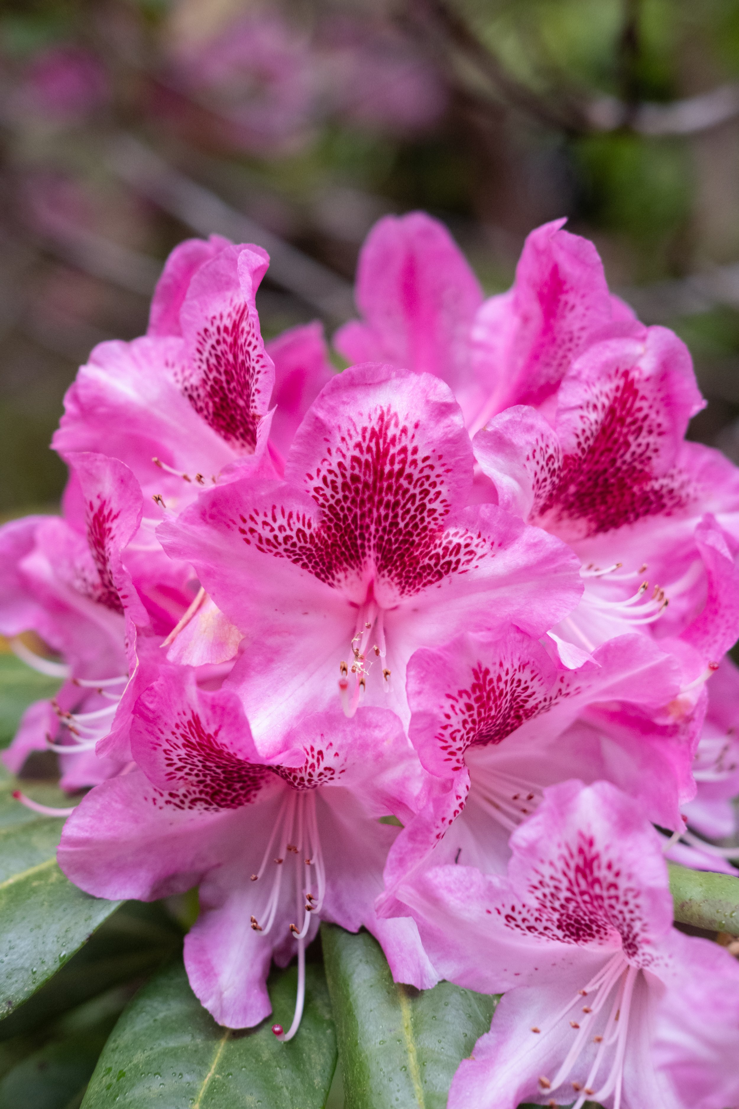 A big puff ball of pink rhododendrons with vivid red animal print insides.