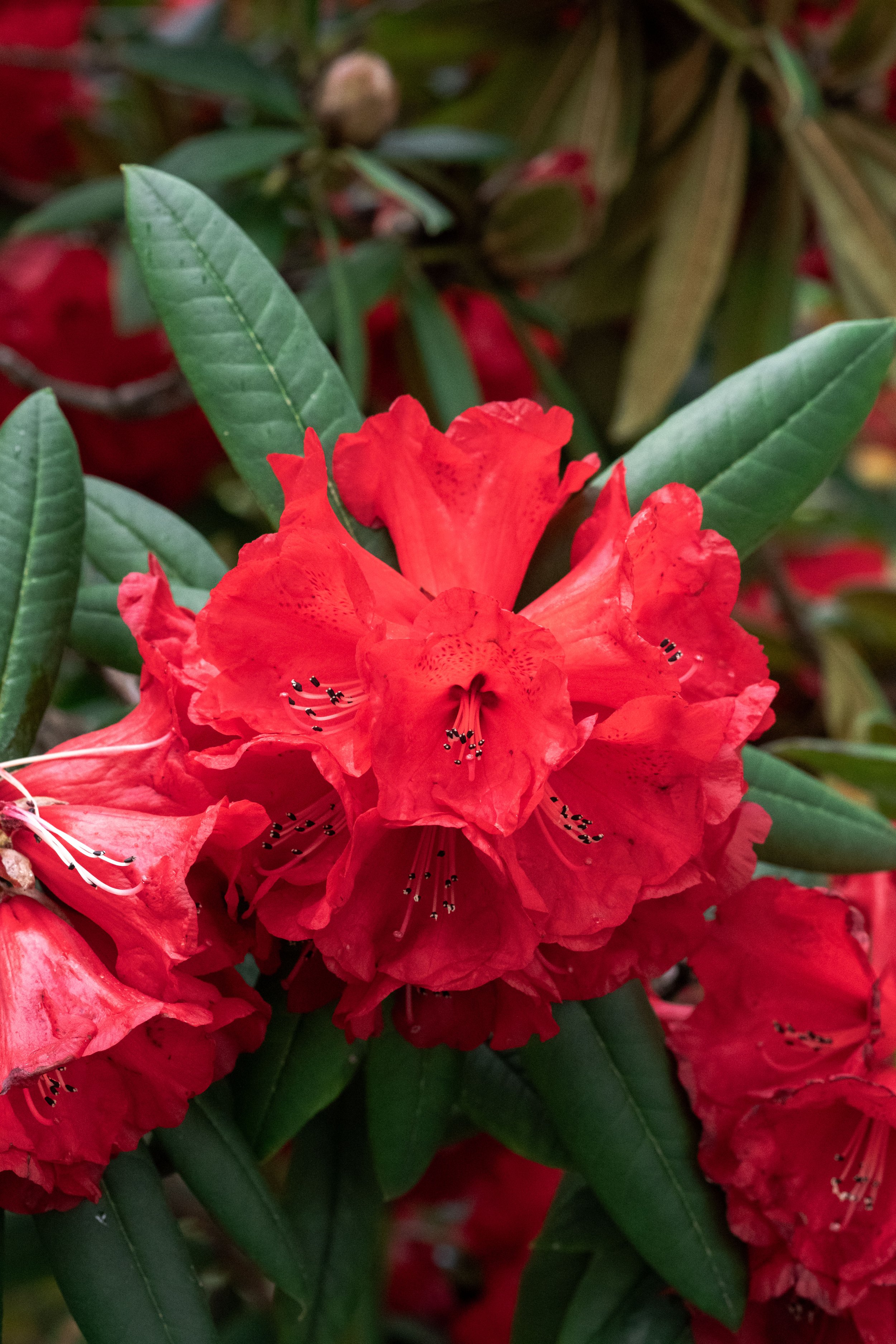 Too-red rhododendrons growing vigorously.