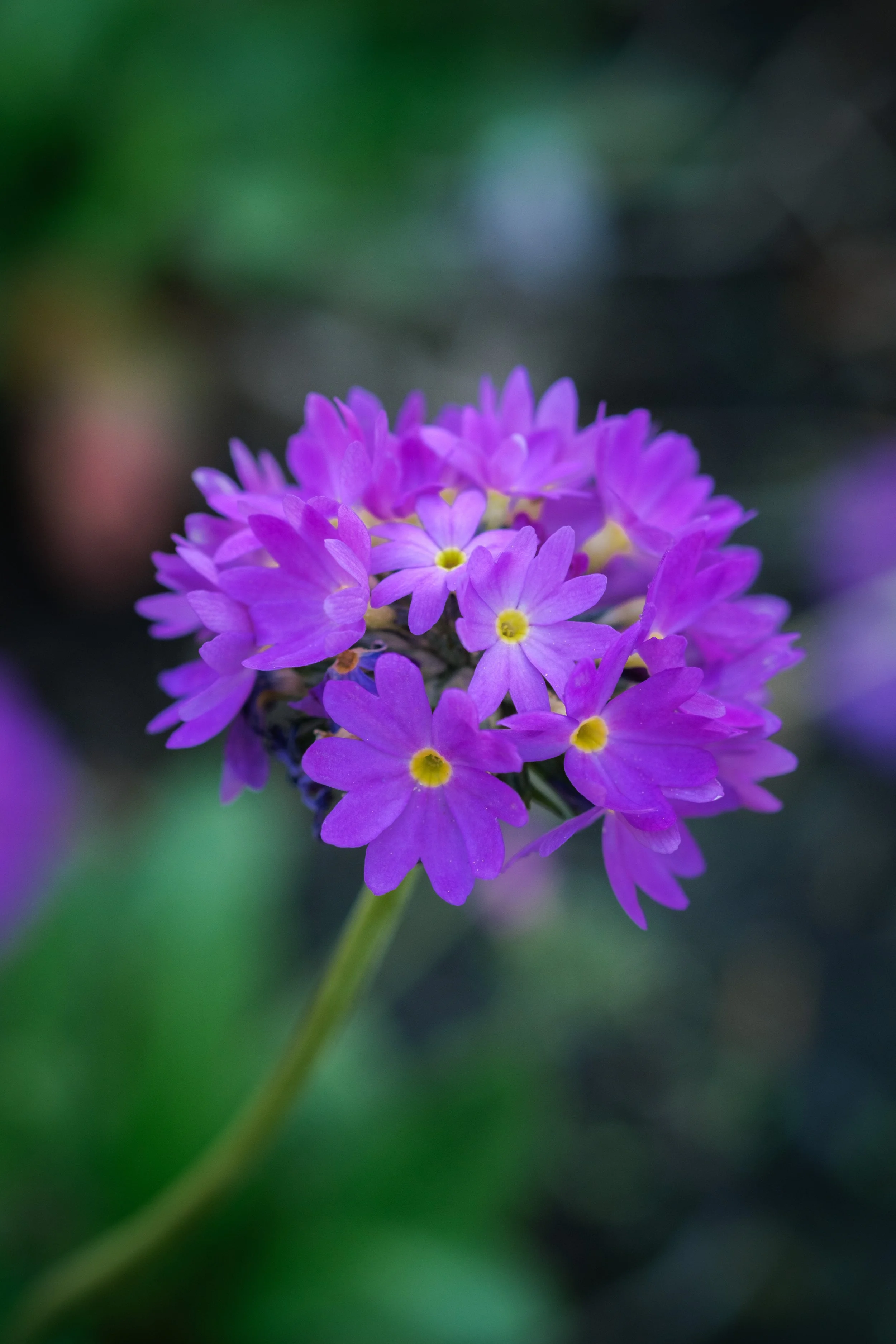 A bright magenta pom pom of a flower cluster with yellow centres in each bloom.