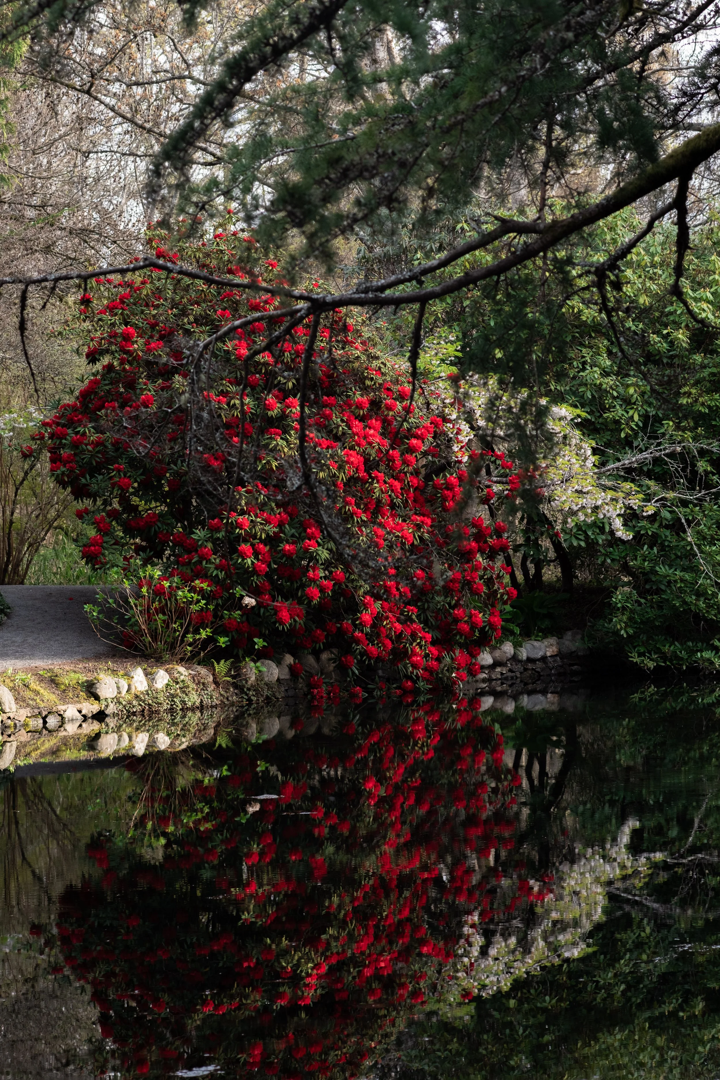 Landscape view of a huge rhododendron bush with a million red flowers hanging over a pond and looking at its reflection.