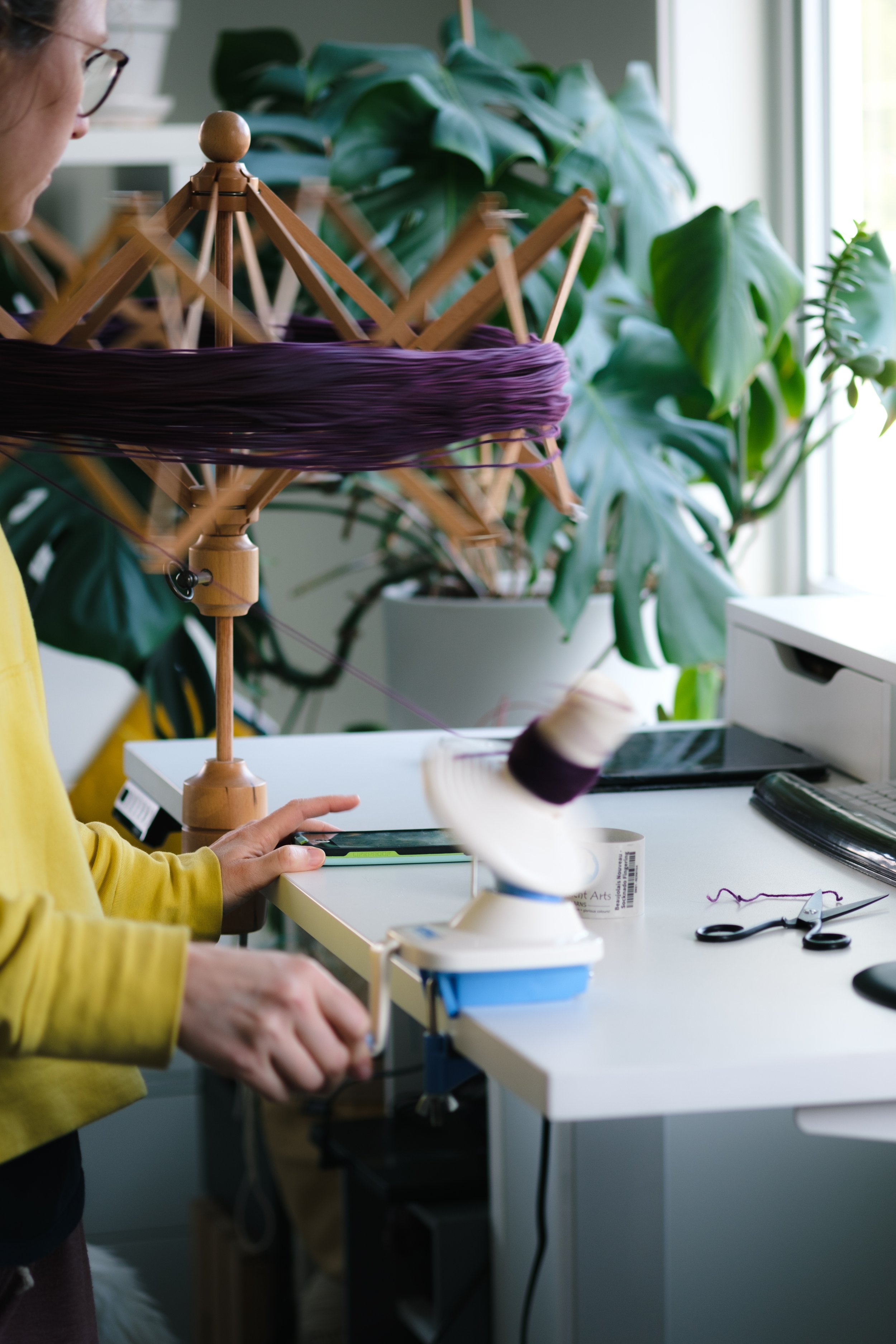 Andrea is standing at her desk, winding a skein of deep purple yarn with a swift and ball winder.