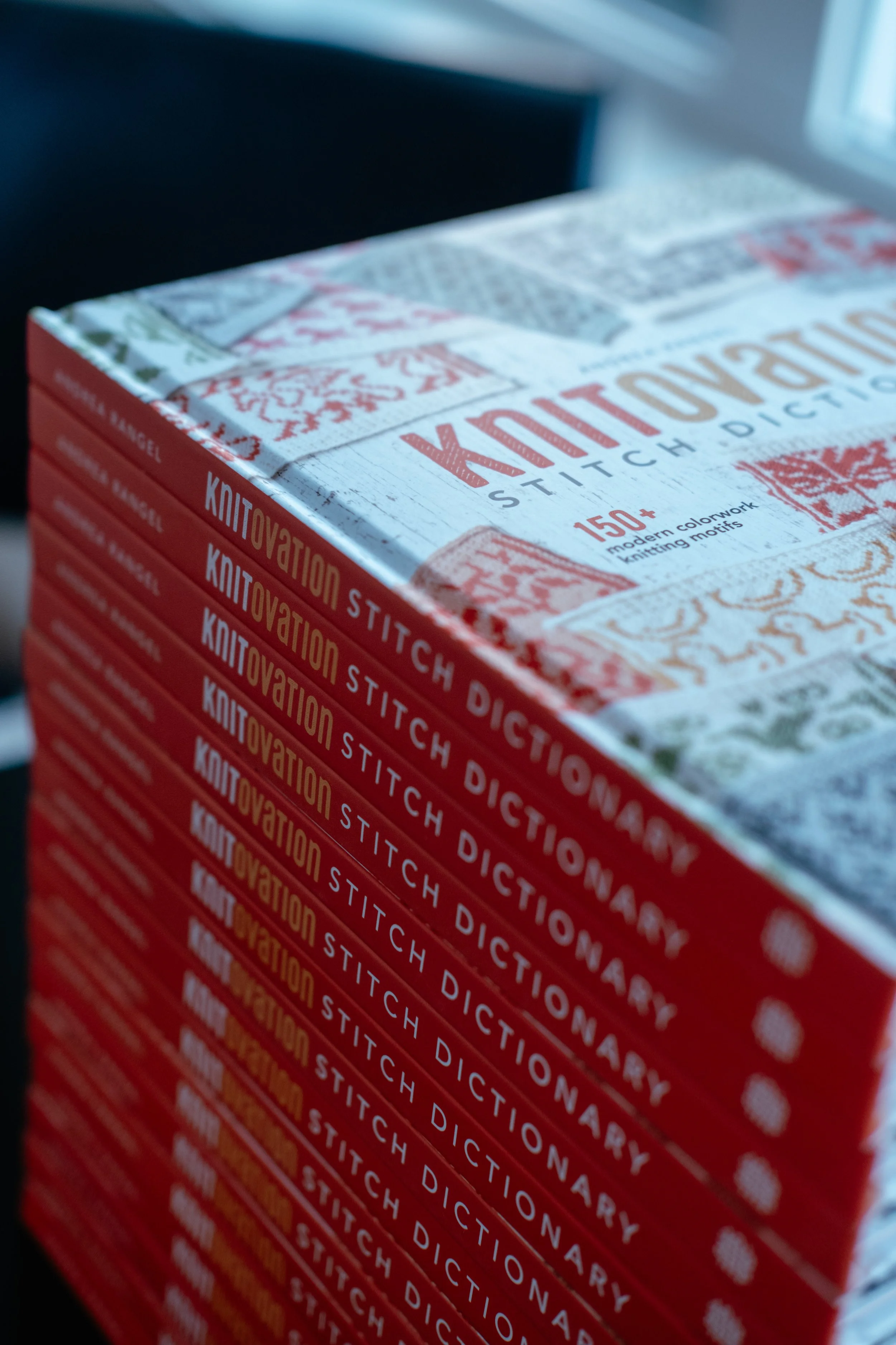 A big stack of books with KnitOvation Stitch Dictionary on the spines and a colourful cover seen at the top of the pile.