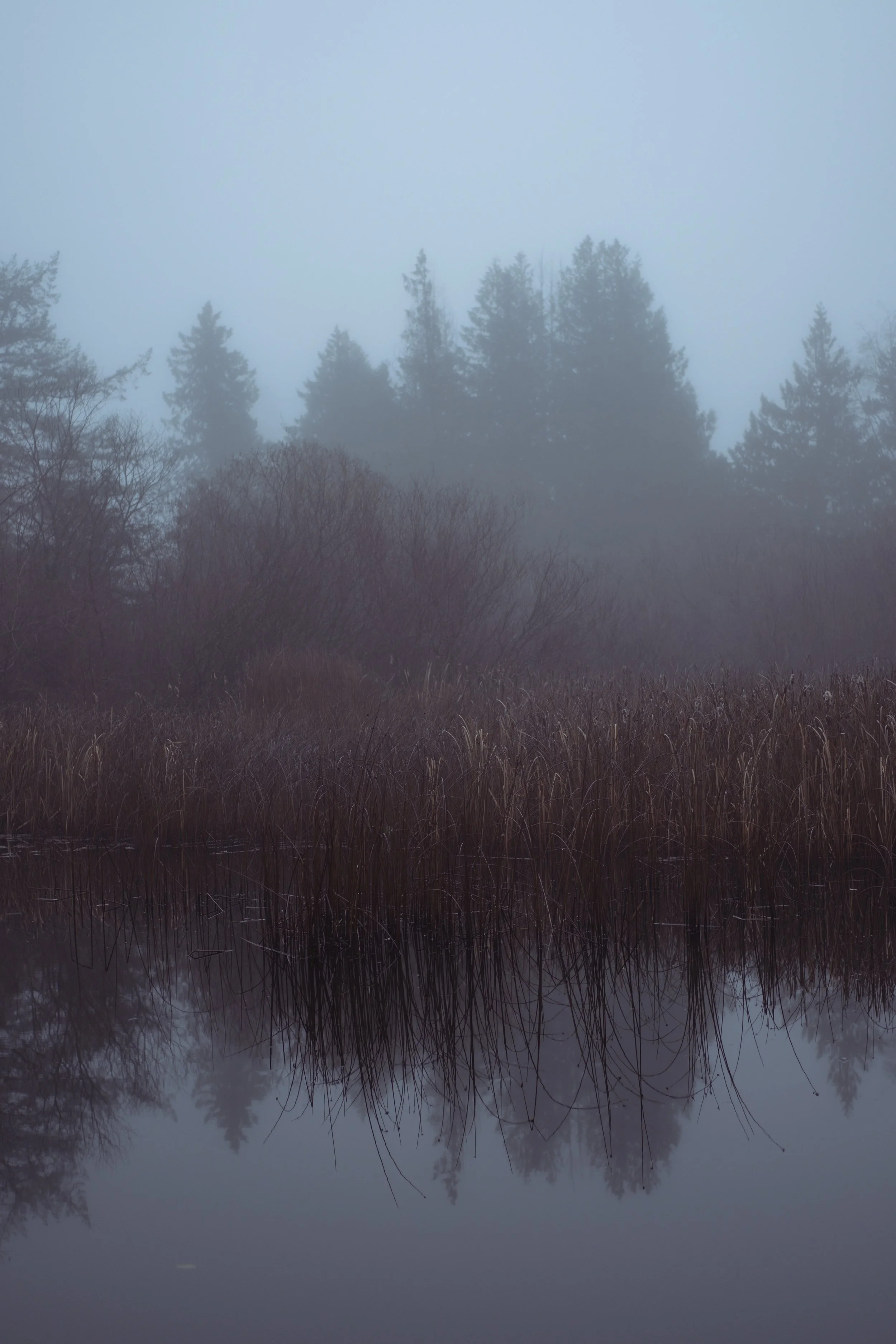 A very foggy marsh landscape with reeds and pale trees reflected in the lake.