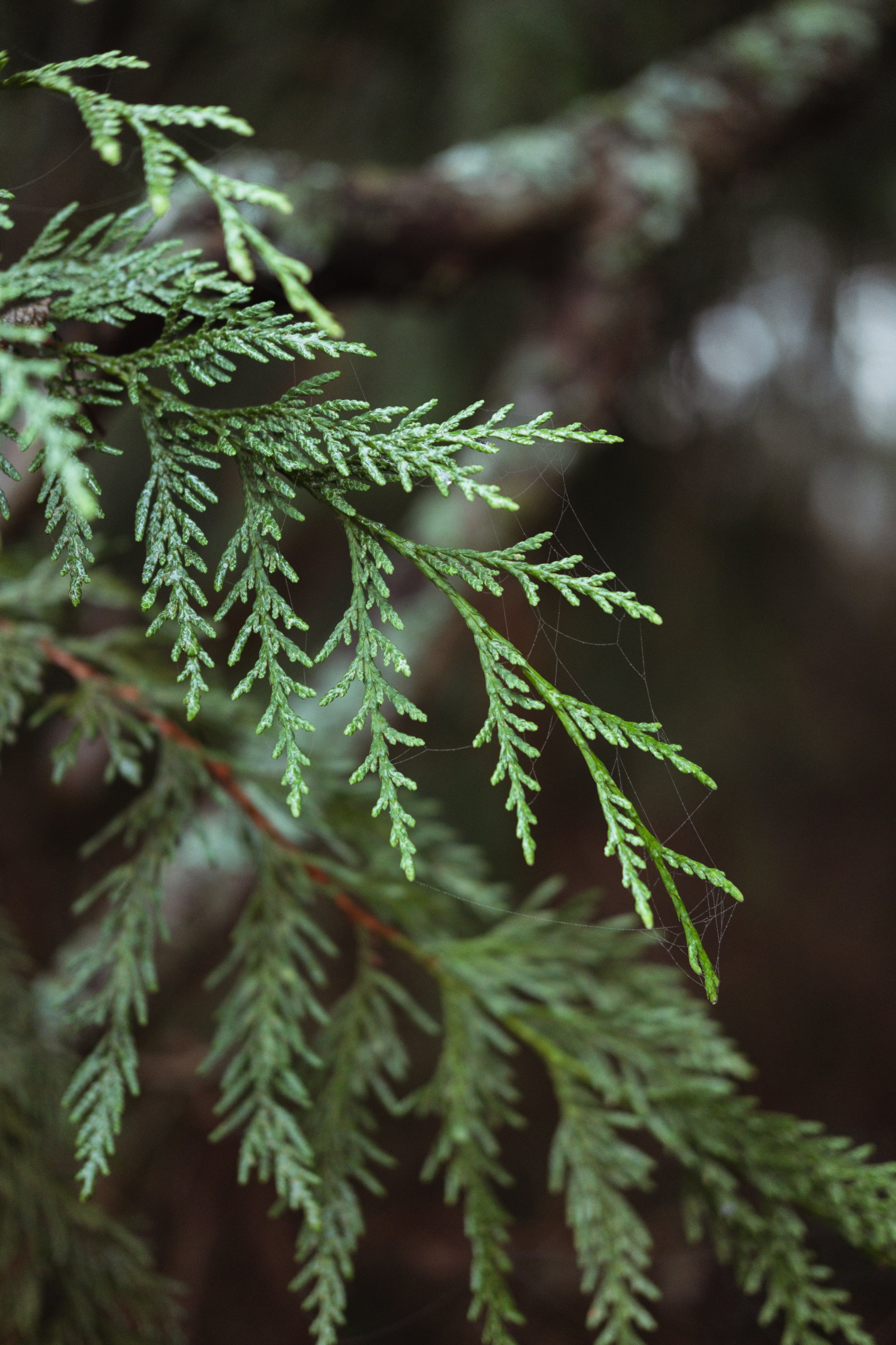 Closeup of a cedar frond with delicate spider webs like lace decorating it.