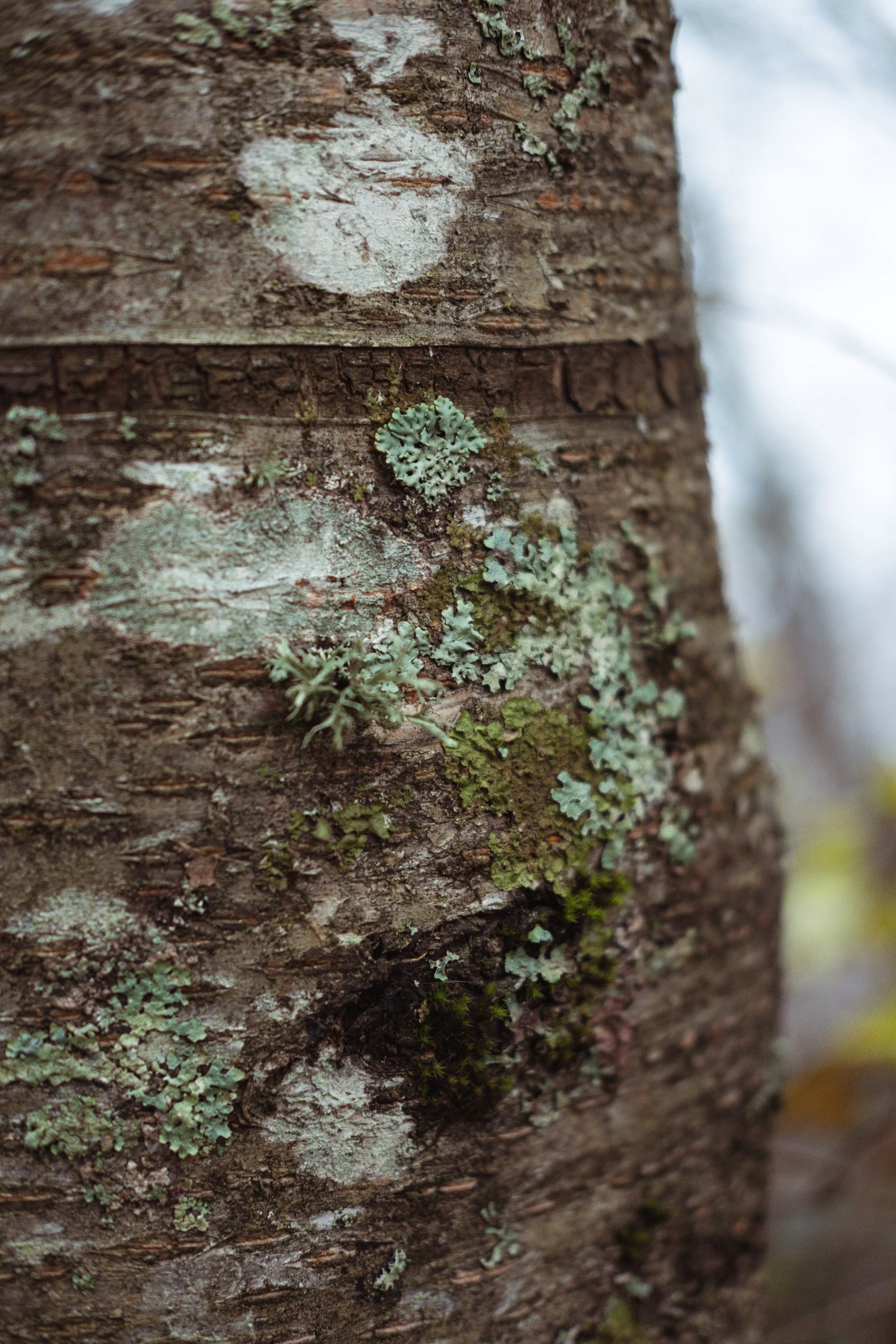 Closeup of the ecosystem of a tree trunk with gnarly bark and a variety of lichens.