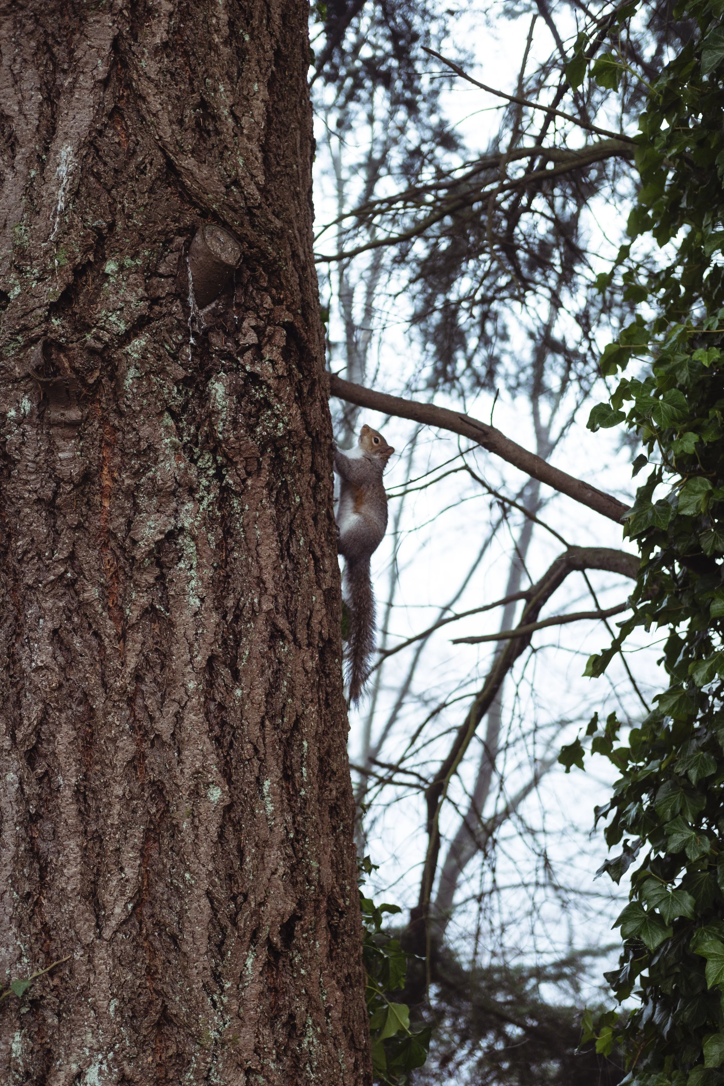 A tiny grey squirrel climbing up the side of a huge tree.