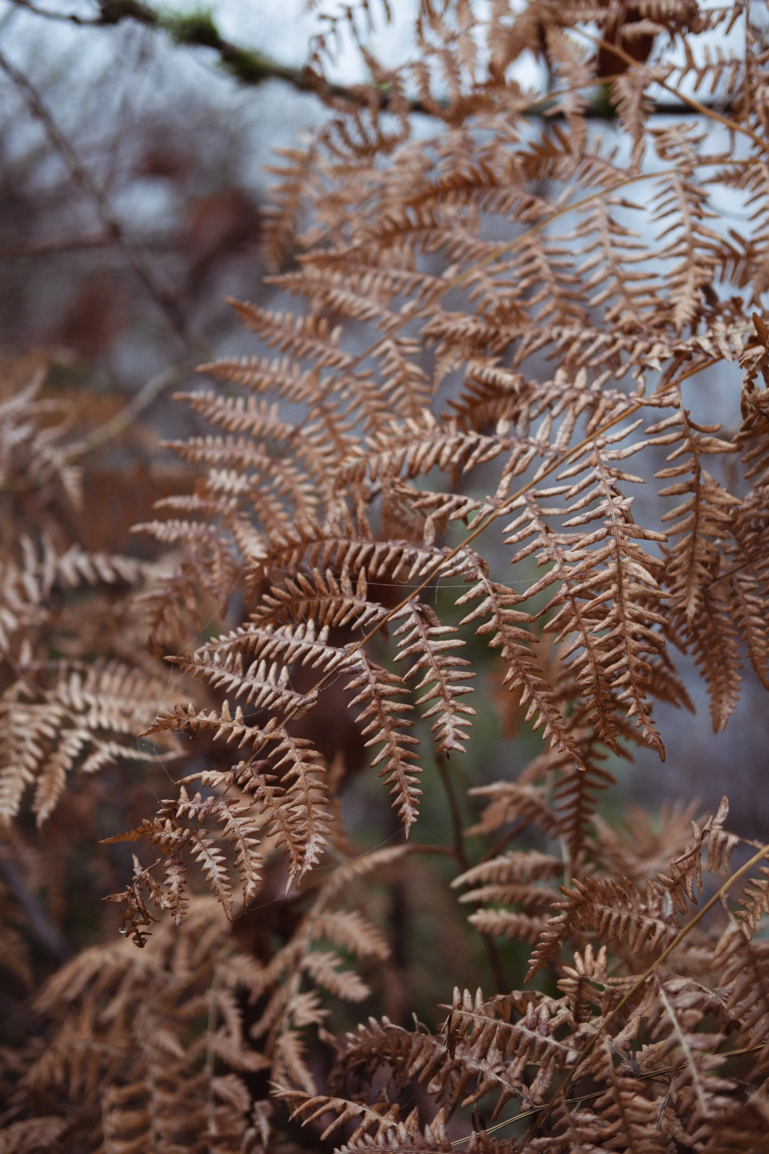 Spindly red branches with spider webs looking like the tiniest pearls draped between them.