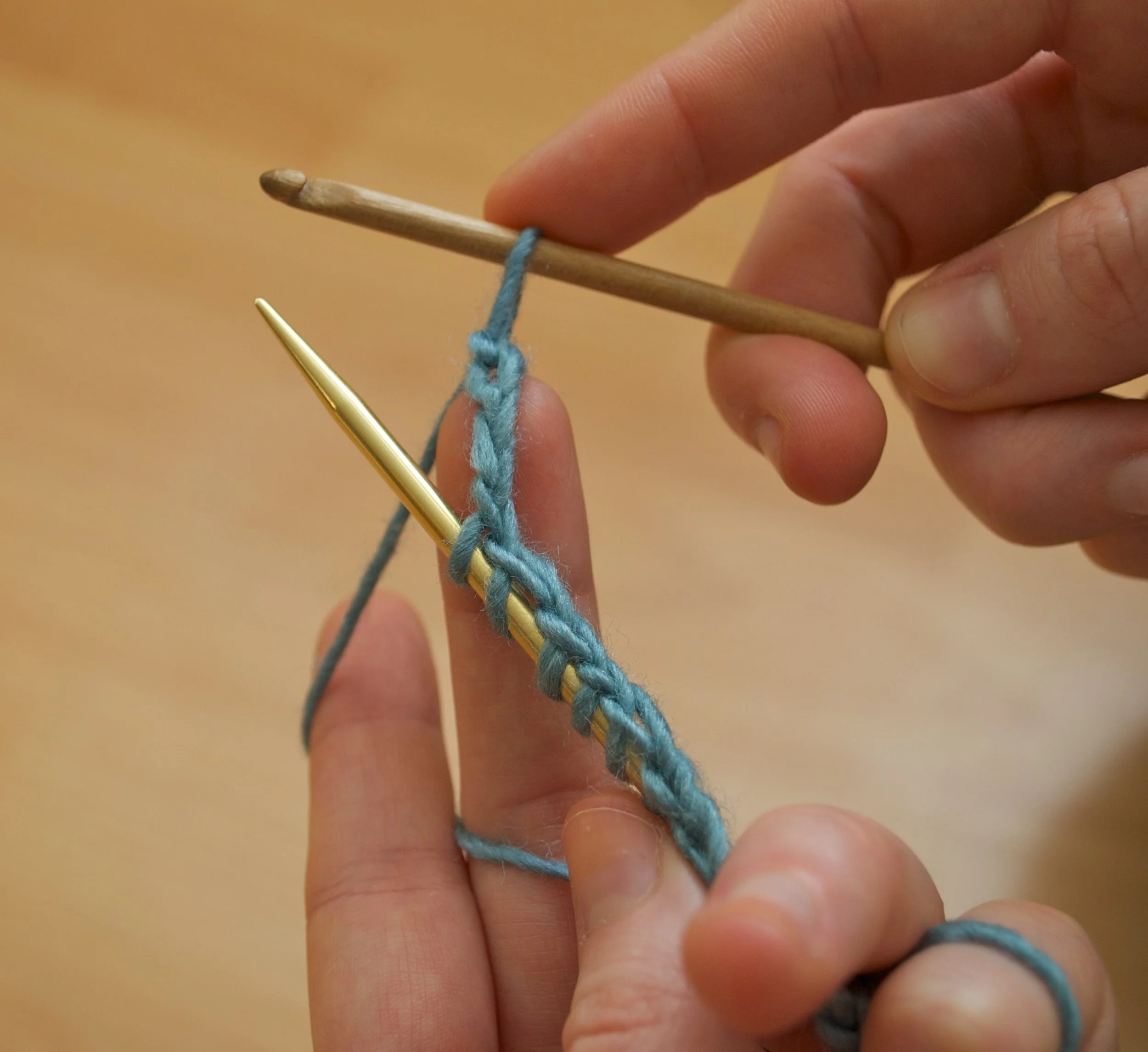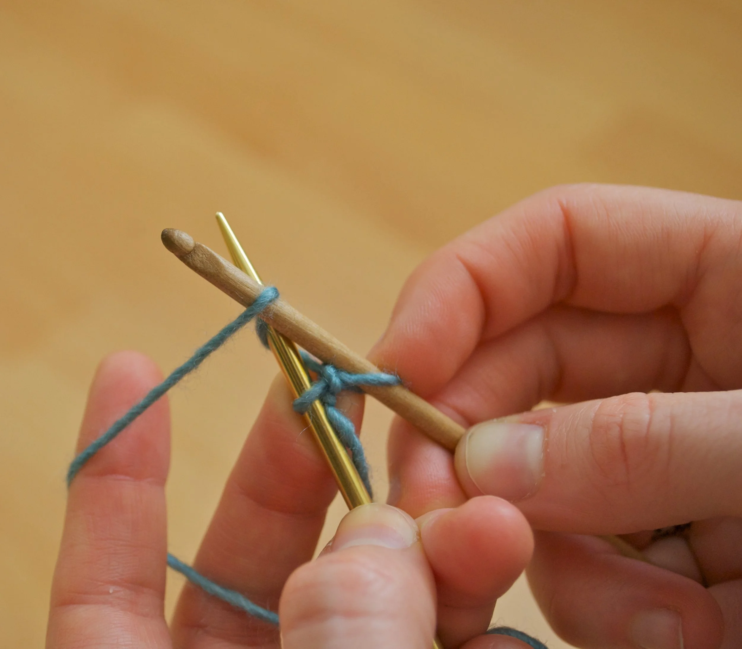 Hold the yarn and knitting needle in left hand with the yarn behind the needle. Hold crochet hook over top of needle.
